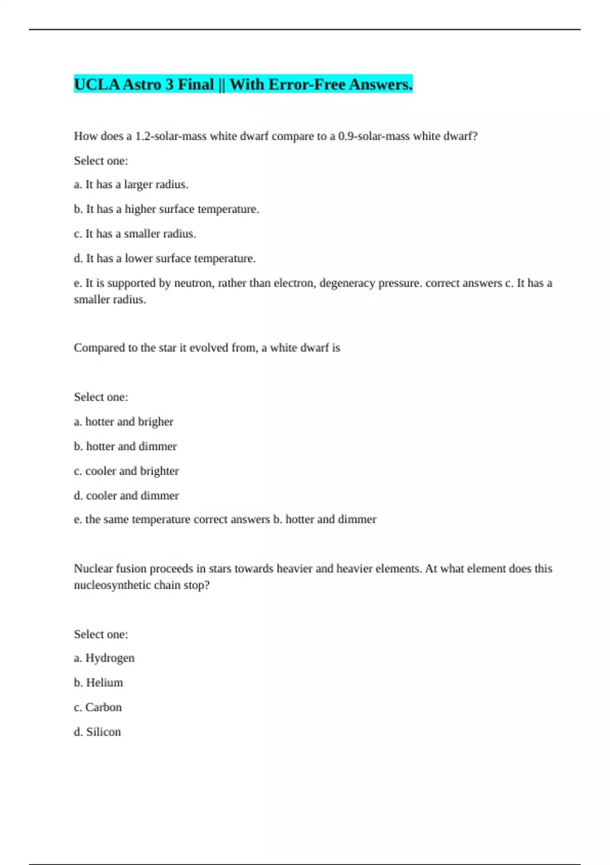 How does a 1.2-solar-mass white dwarf compare to a 0.9-solar-mass white dwarf? Select one: a. It has a larger radius. b. It has a higher surface temperature. c. It has a smaller radius. d. It has a lower surface temperature. e. It is supported by neutron, rather than electron, degeneracy pressure. correct answers c. It has a smaller radius. Compared to the star it evolved from, a white dwarf is Select one: a. hotter and brigher b. hotter and dimmer c. cooler and brighter d. cooler and dimmer e. the same temperature correct answers b. hotter and dimmer Nuclear fusion proceeds in stars towards heavier and heavier elements. At what element does this nucleosynthetic chain stop? Select one: a. Hydrogen b. Helium c. Carbon
