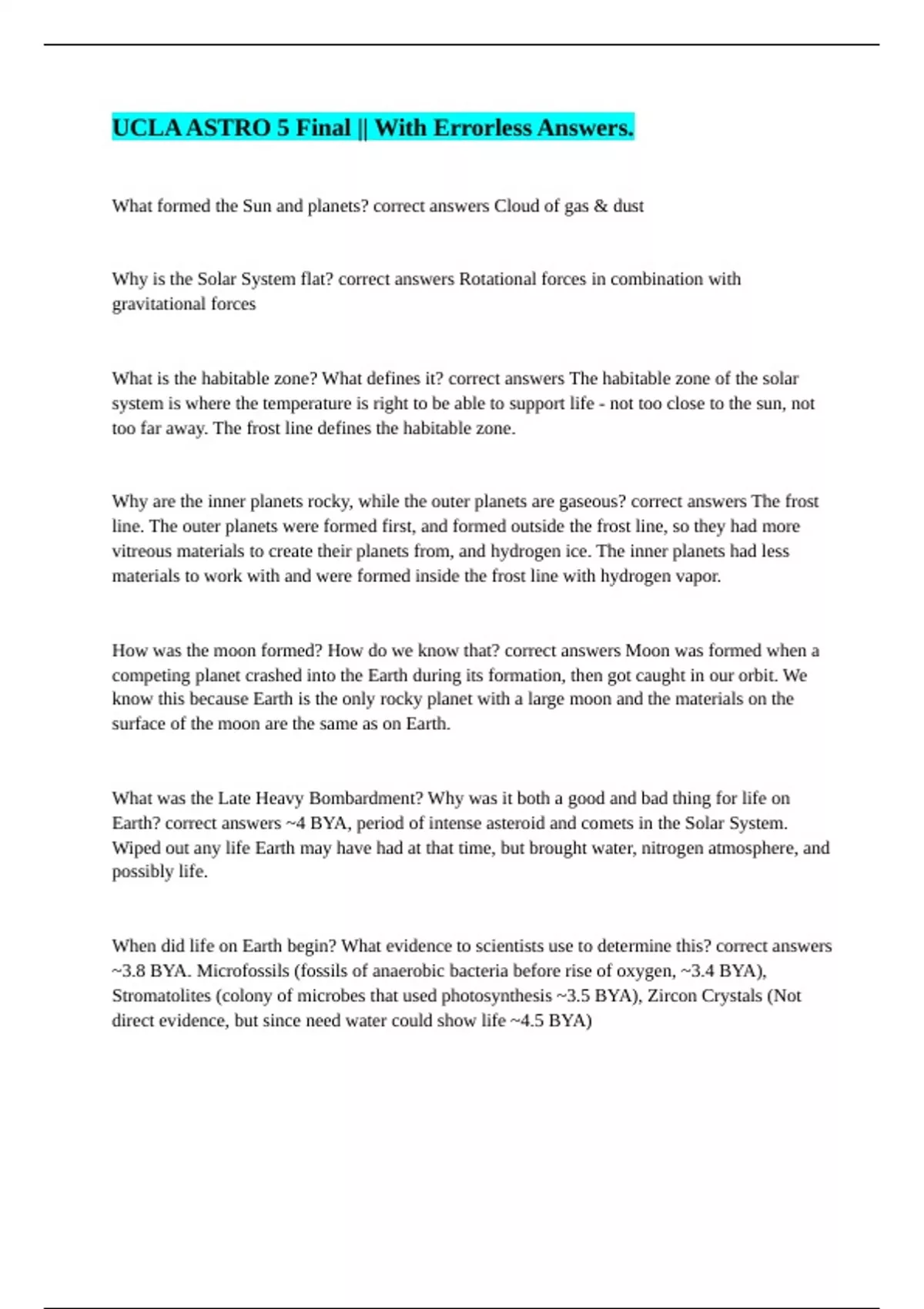 What formed the Sun and planets? correct answers Cloud of gas & dust Why is the Solar System flat? correct answers Rotational forces in combination with gravitational forces What is the habitable zone? What defines it? correct answers The habitable zone of the solar system is where the temperature is right to be able to support life - not too close to the sun, not too far away. The frost line defines the habitable zone. Why are the inner planets rocky, while the outer planets are gaseous? correct answers The frost line. The outer planets were formed first, and formed outside the frost line, so they had more vitreous materials to create their planets from, and hydrogen ice. The inner planets had less materials to work with and were formed inside the frost line with hydrogen vapor. How was the moon formed? How do we know that? correct answers Moon was formed when a competing planet crashed into the Earth during its formation, then got caught in our orbit. We know this because Earth is the only rocky planet with a large moon and the materials on the surface of the moon are the same as on Earth. What was the Late Heavy Bombardment? Why was it both a good and bad thing for life on Earth? correct answers ~4 BYA, period of intense asteroid and comets in the Solar System. Wiped out any life Earth may have had at that time, but brought water, nitrogen atmosphere, and possibly life. When did life on Earth begin? What evidence to scientists use to determine this? correct answers ~3.8 BYA. Microfossils (fossils of anaerobic bacteria before rise of oxygen, ~3.4 BYA), Stromatolites (colony of microbes that used photosynthesis ~3.5 BYA), Zircon Crystals (Not direct evidence, but since need water could show life ~4.5 BYA)