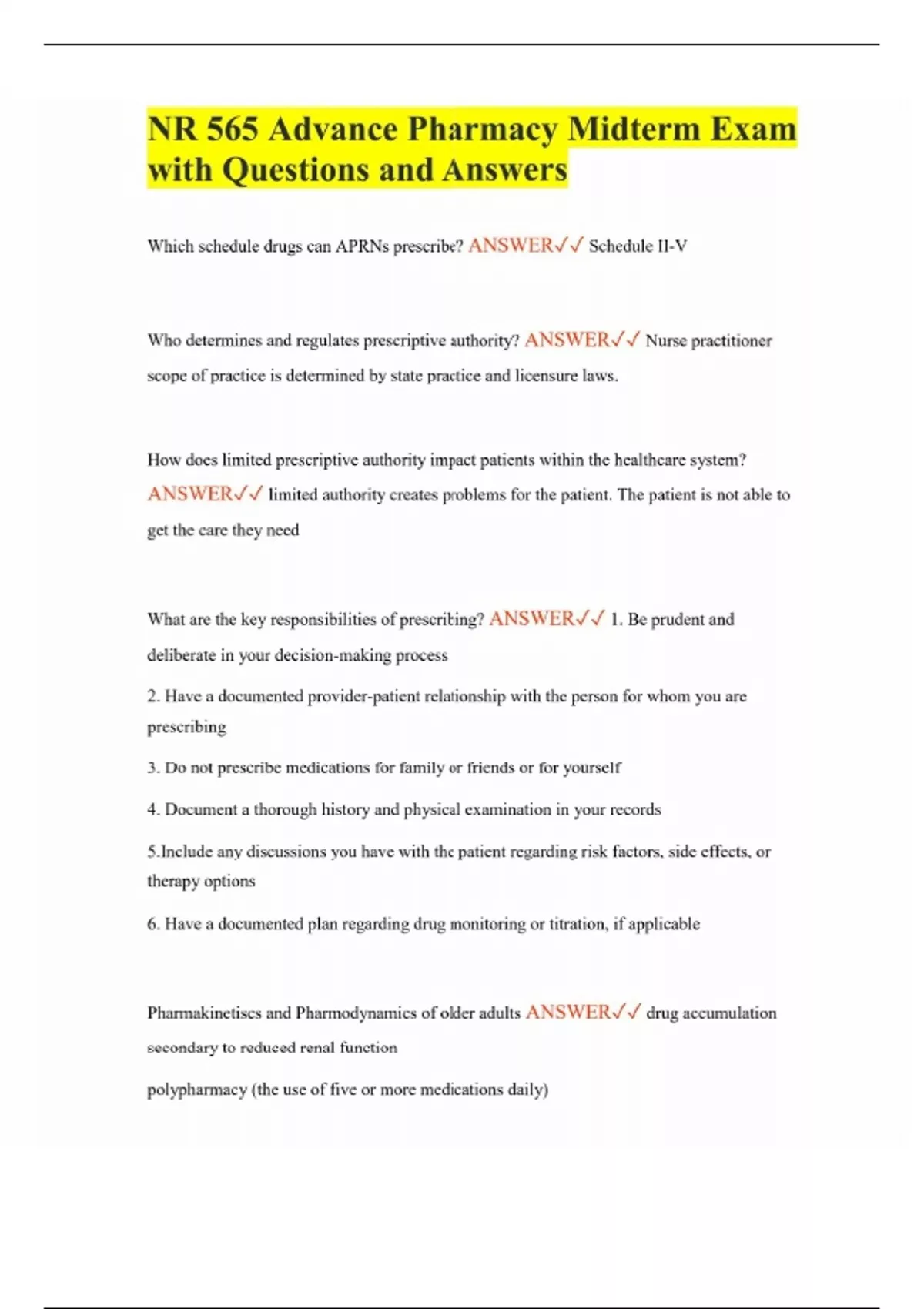 NR 565 Advance Pharmacy Midterm Exam with Questions and Answers Which schedule drugs can APRNs prescribe? ANSWER Schedule II-V Who determines and regulates prescriptive authority? ANSWER Nurse practitioner scope of practice is determined by state practice and licensure laws. How does limited prescriptive authority impact patients within the healthcare system? ANSWER limited authority creates problems for the patient. The patient is not able to get the care they need What are the key responsibilities of prescribing? ANSWER 1. Be prudent and deliberate in your decision-making process 2. Have a documented provider-patient relationship with the person for whom you are prescribing 3. Do not prescribe medications for family or friends or for yourself 4. Document a thorough history and physical examination in your records 5.Include any discussions you have with the patient regarding risk factors, side effects, or therapy options 6. Have a documented plan regarding drug monitoring or titration, if applicable Pharmakinetiscs and Pharmodynamics of older adults ANSWER drug accumulation secondary to reduced renal function polypharmacy (the use of five or more medications daily)