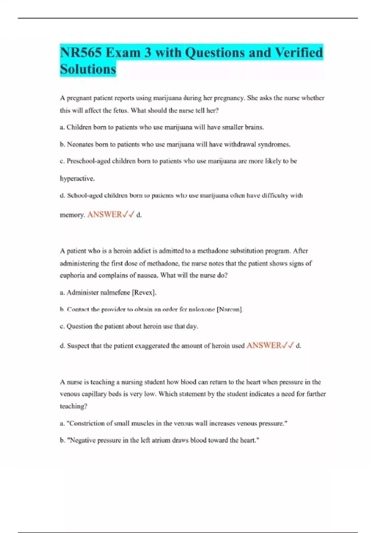 NR565 Exam 3 with Questions and Verified Solutions A pregnant patient reports using marijuana during her pregnancy. She asks the nurse whether this will affect the fetus. What should the nurse tell her? a. Children born to patients who use marijuana will have smaller brains. b. Neonates born to patients who use marijuana will have withdrawal syndromes. c. Preschool-aged children born to patients who use marijuana are more likely to be hyperactive. d. School-aged children born to patients who use marijuana often have difficulty with memory. ANSWER d. A patient who is a heroin addict is admitted to a methadone substitution program. After administering the first dose of methadone, the nurse notes that the patient shows signs of euphoria and complains of nausea. What will the nurse do? a. Administer nalmefene [Revex]. b. Contact the provider to obtain an order for naloxone [Narcan]. c. Question the patient about heroin use that day. d. Suspect that the patient exaggerated the amount of heroin used ANSWER d. A nurse is teaching a nursing student how blood can return to the heart when pressure in the venous capillary beds is very low. Which statement by the student indicates a need for further teaching? a. "Constriction of small muscles in the venous wall increases venous pressure." b. "Negative pressure in the left atrium draws blood toward the heart."