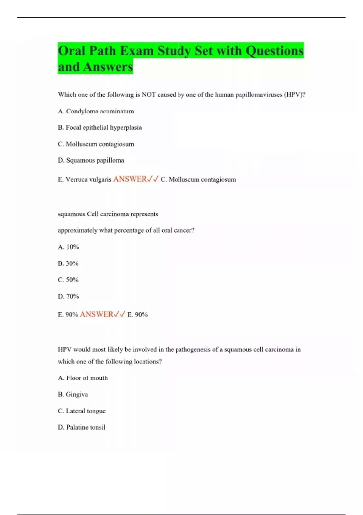 Oral Path Exam Study Set with Questions and Answers Which one of the following is NOT caused by one of the human papillomaviruses (HPV)? A. Condyloma acuminatum B. Focal epithelial hyperplasia C. Molluscum contagiosum D. Squamous papilloma E. Verruca vulgaris ANSWER C. Molluscum contagiosum squamous Cell carcinoma represents approximately what percentage of all oral cancer? A. 10% B. 30% C. 50% D. 70% E. 90% ANSWER E. 90% HPV would most likely be involved in the pathogenesis of a squamous cell carcinoma in which one of the following locations? A. Floor of mouth B. Gingiva C. Lateral tongue D. Palatine tonsil