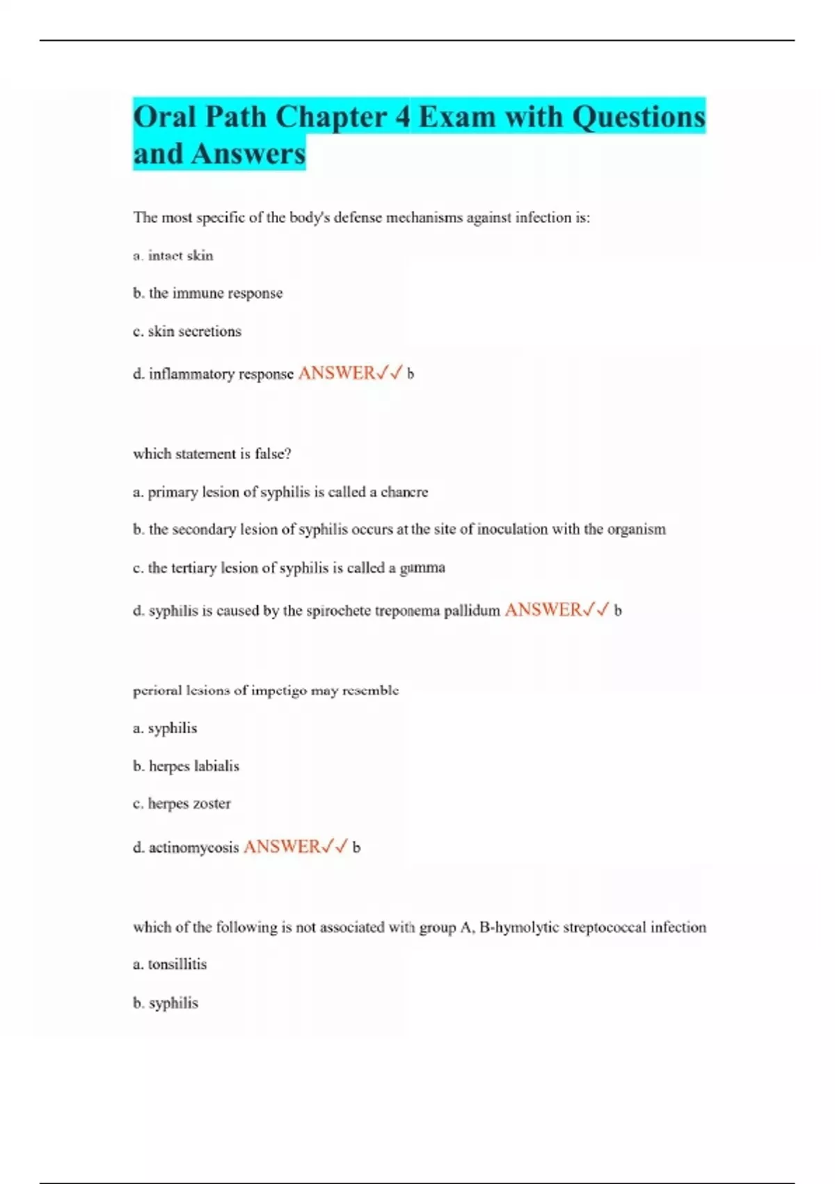 Oral Path Chapter 4 Exam with Questions and Answers The most specific of the body's defense mechanisms against infection is: a. intact skin b. the immune response c. skin secretions d. inflammatory response ANSWER b which statement is false? a. primary lesion of syphilis is called a chancre b. the secondary lesion of syphilis occurs at the site of inoculation with the organism c. the tertiary lesion of syphilis is called a gumma d. syphilis is caused by the spirochete treponema pallidum ANSWER b perioral lesions of impetigo may resemble a. syphilis b. herpes labialis c. herpes zoster d. actinomycosis ANSWER b which of the following is not associated with group A, B-hymolytic streptococcal infection a. tonsillitis b. syphilis