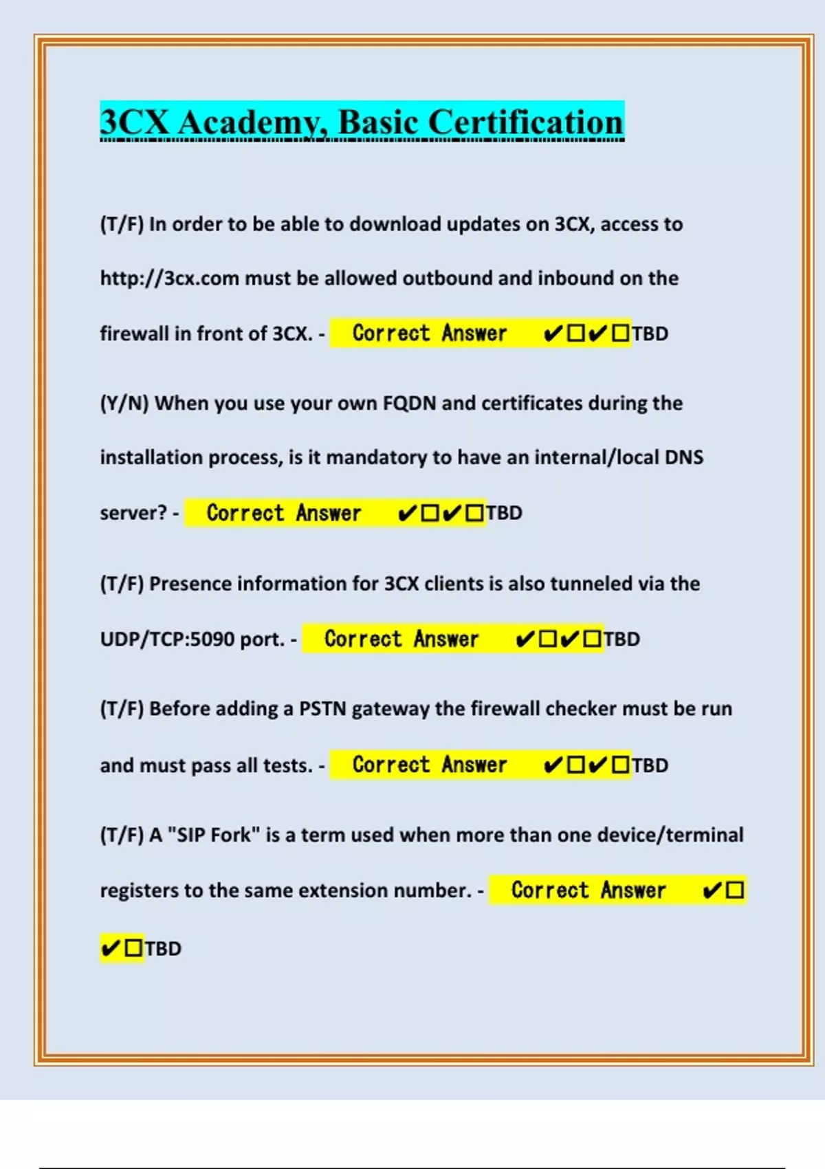 (T/F) In order to be able to download updates on 3CX, access to must be allowed outbound and inbound on the firewall in front of 3CX. - Correct Answer ️️TBD (Y/N) When you use your own FQDN and certificates during the installation process, is it mandatory to have an internal/local DNS server? - Correct Answer ️️TBD (T/F) Presence information for 3CX clients is also tunneled via the UDP/TCP:5090 port. - Correct Answer ️️TBD (T/F) Before adding a PSTN gateway the firewall checker must be run and must pass all tests. - Correct Answer ️️TBD