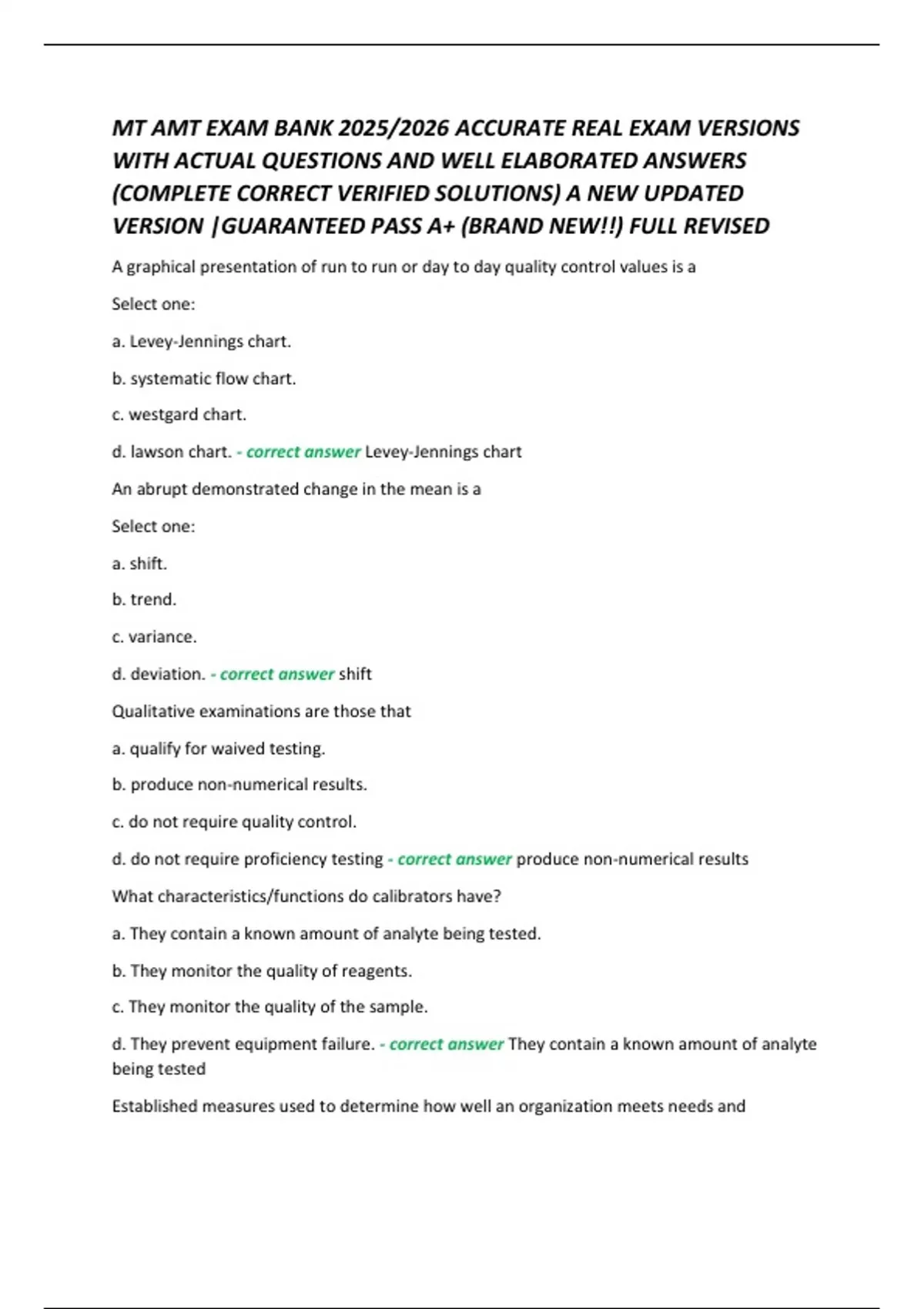 A graphical presentation of run to run or day to day quality control values is a Select one: a. Levey-Jennings chart. b. systematic flow chart. c. westgard chart. d. lawson chart. - correct answer Levey-Jennings chart An abrupt demonstrated change in the mean is a Select one: a. shift. b. trend. c. variance. d. deviation. - correct answer shift Qualitative examinations are those that a. qualify for waived testing. b. produce non-numerical results. c. do not require quality control. d. do not require proficiency testing - correct answer produce non-numerical results What characteristics/functions do calibrators have? a. They contain a known amount of analyte being tested. b. They monitor the quality of reagents. c. They monitor the quality of