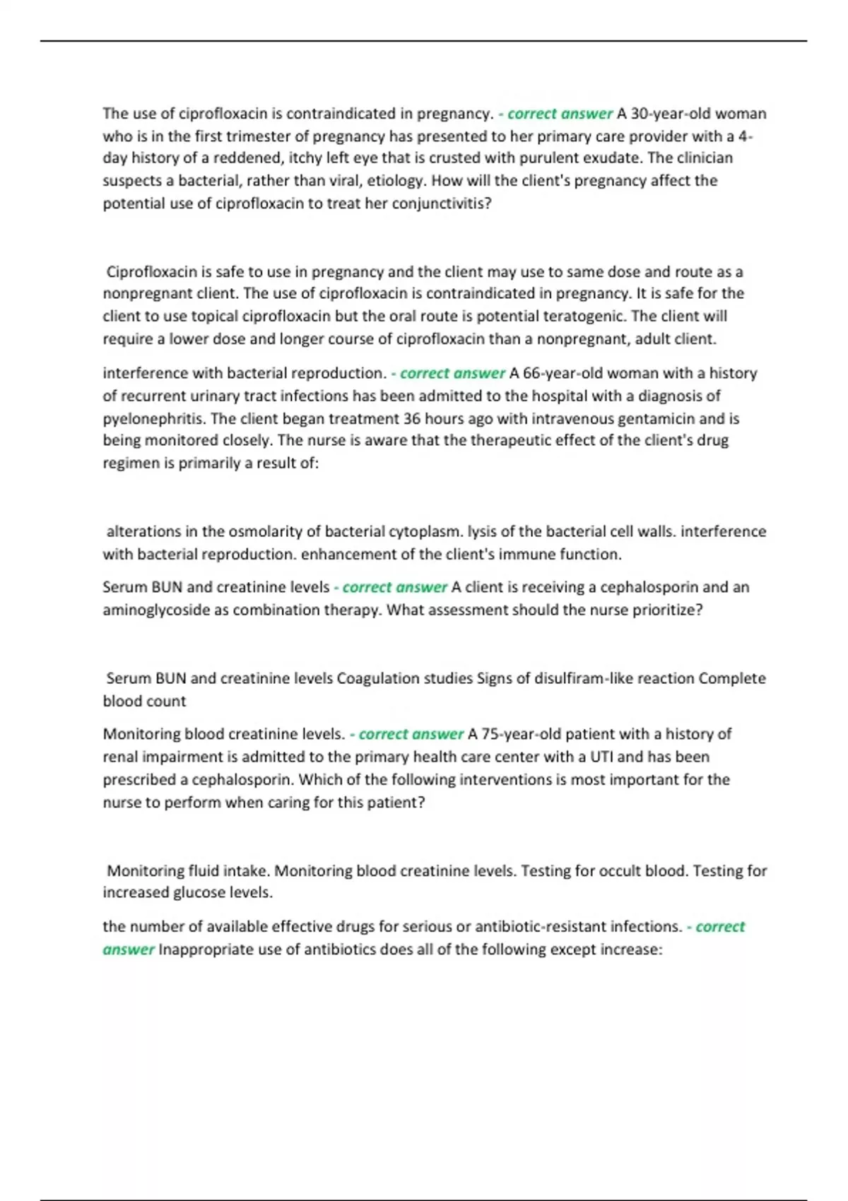 The use of ciprofloxacin is contraindicated in pregnancy. - correct answer A 30-year-old woman who is in the first trimester of pregnancy has presented to her primary care provider with a 4-day history of a reddened, itchy left eye that is crusted with purulent exudate. The clinician suspects a bacterial, rather than viral, etiology. How will the client's pregnancy affect the potential use of ciprofloxacin to treat her conjunctivitis? Ciprofloxacin is safe to use in pregnancy and the client may use to same dose and route as a nonpregnant client. The use of ciprofloxacin is contraindicated in pregnancy. It is safe for the client to use topical ciprofloxacin but the oral route is potential teratogenic. The client will require a lower dose and longer course of ciprofloxacin than a nonpregnant, adult client. interference with bacterial reproduction. - correct answer A 66-year-old woman with a history of recurrent urinary tract infections has been admitted to the hospital with a diagnosis of pyelonephritis. The client began treatment 36 hours ago with intravenous gentamicin and is being monitored closely. The nurse