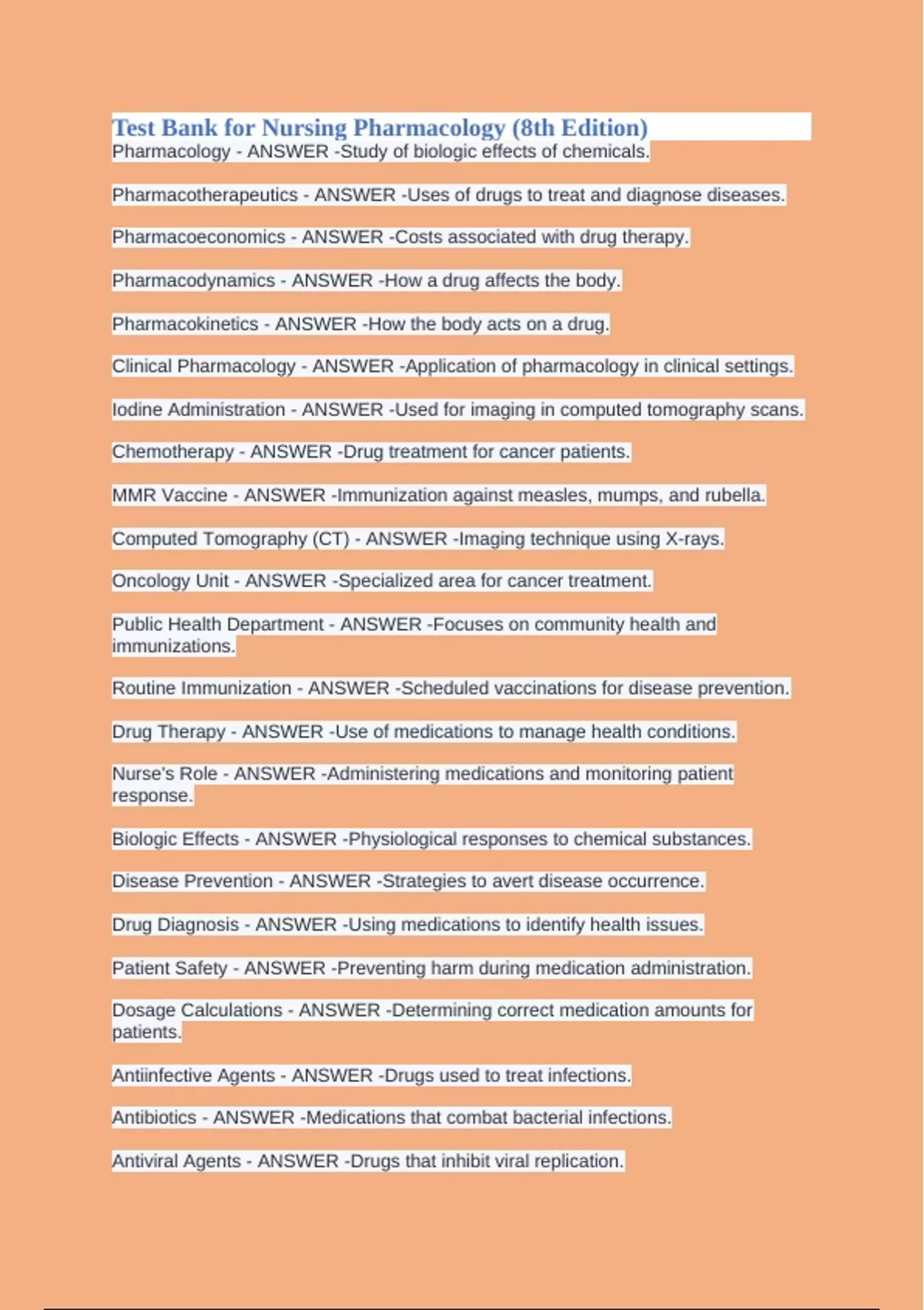 Test Bank for Nursing Pharmacology (8th Edition) Pharmacology - ANSWER -Study of biologic effects of chemicals. Pharmacotherapeutics - ANSWER -Uses of drugs to treat and diagnose diseases. Pharmacoeconomics - ANSWER -Costs associated with drug therapy. Pharmacodynamics - ANSWER -How a drug affects the body. Pharmacokinetics - ANSWER -How the body acts on a drug. Clinical Pharmacology - ANSWER -Application of pharmacology in clinical settings. Iodine Administration - ANSWER -Used for imaging in computed tomography scans. Chemotherapy - ANSWER -Drug treatment for cancer patients. MMR Vaccine - ANSWER -Immunization against measles, mumps, and rubella. Computed Tomography (CT) - ANSWER -Imaging technique using X-rays. Oncology Unit - ANSWER -Specialized area for cancer treatment. Public Health Department - ANSWER -Focuses on community health and immunizations. Routine Immunization - ANSWER -Scheduled vaccinations for disease prevention. Drug Therapy - ANSWER -Use of medications to manage health conditions. Nurse's Role - ANSWER -Administering medications and monitoring patient response. Biologic Effects - ANSWER -Physiological responses to chemical substances. Disease Prevention - ANSWER -Strategies to avert disease occurrence. Drug Diagnosis - ANSWER -Using medications to identify health issues. Patient Safety - ANSWER -Preventing harm during medication administration. Dosage Calculations - ANSWER -Determining correct medication amounts for patients. Antiinfective Agents - ANSWER -Drugs used to treat infections. Antibiotics - ANSWER -Medications that combat bacterial infections. Antiviral Agents - ANSWER -Drugs that inhibit viral replication. Antifungal Agents - ANSWER -Medications used to treat fungal infections. Morphine - ANSWER -A narcotic classified as Schedule II drug. Schedule II - ANSWER -Drugs with high abuse potential and medical use. Schedule I - ANSWER -Drugs with high abuse potential, no medical use. Schedule III - ANSWER -Drugs with lesser abuse potential, accepted medical use. Schedule IV - ANSWER -Drugs with low abuse potential and limited dependence. Phase III studies - ANSWER -Involve drug use in large clinical populations. Nurse responsibilities - ANSWER -Monitor patients for adverse effects during studies. Bioavailability - ANSWER -Portion of drug reaching systemic circulation. Critical concentration - ANSWER -Amount of drug needed for therapeutic effect. Distribution - ANSWER -Movement of drug to body tissues. Half-life - ANSWER -Time for drug amount to decrease by half. Generic drugs - ANSWER -Substitutes for brand name drugs with potential differences. Brand name drugs - ANSWER -Medications marketed under a proprietary name. Over-the-counter medications - ANSWER -Drugs available without prescription, often overlooked. Orphan drugs - ANSWER -Medications for rare diseases, often not well known. Pharmacologic therapy - ANSWER -Study of drug effects and safe administration. Drug evaluation studies - ANSWER -Research phases assessing drug safety and efficacy. Adverse effects - ANSWER -Unintended, harmful reactions to medications. Clinical population - ANSWER -Group of patients involved in drug studies. FDA - ANSWER -Food and Drug Administration, oversees drug approval. Preclinical trials - ANSWER -Initial testing phase using animal subjects. Patient monitoring - ANSWER -Nurse's role in observing drug effects. Drug guide - ANSWER -Resource for specific drug information and safety. Medication administration - ANSWER -Process of giving drugs to patients safely. Pharmacology - ANSWER -Study of drug actions and effects on the body. Pregnancy Category B - ANSWER -Animal studies show no fetal risk; no human studies. OTC Drugs - ANSWER -Over-the-counter medications that can cause harm if misused. Nurse's Drug Guide - ANSWER -Essential resource for nursing implications and patient education. FDA - ANSWER -Food and Drug Administration; regulates drug safety and efficacy. Category A Drugs - ANSWER -No risk to fetus in first or later trimesters. Category C Drugs - ANSWER -Animal studies show adverse effects; no human studies. Category D Drugs - ANSWER -Evidence of human fetal risk; potential benefits may outweigh risks. Discharge Planning - ANSWER -Instructions for patients leaving the hospital, including medications. Drug Monographs - ANSWER -Detailed drug information including uses, side effects, and dosing. Continuing Education - ANSWER -Ongoing learning necessary for safe nursing practice. Adverse Effects - ANSWER -Unintended harmful effects caused by medication use. Medication Administration - ANSWER -Process of giving medications to patients safely. Drug Package Insert - ANSWER -Official document providing detailed drug information. Multidose Bottle - ANSWER -Container holding multiple doses of a medication. Drug Facts and Comparisons - ANSWER -Reference book providing drug information for healthcare professionals. Physicians' Drug Reference (PDR) - ANSWER -Comprehensive drug information source for physicians. Nursing Implications - ANSWER -Considerations for patient care related to medication use. Patient Teaching Points - ANSWER -Key information nurses provide to patients about medications. Research New Drugs - ANSWER -Essential for nurses to stay updated on medications. Medication Safety - ANSWER -Practices ensuring safe administration of drugs to patients. Adverse Drug Reactions - ANSWER -Harmful responses to medications that require monitoring. Drug Research - ANSWER -Ongoing studies to evaluate new and existing medications. Multidose bottle - ANSWER -Container holding multiple doses of medication. Soiled label - ANSWER -Label damaged, obscuring important medication information. Priority action - ANSWER -Immediate response to ensure patient safety. Drug label information - ANSWER -Includes drug name, concentration, expiration date. Discard medication - ANSWER -Safest action when label information is unclear. Pharmacotherapeutic level - ANSWER -Study of drug effects on the b