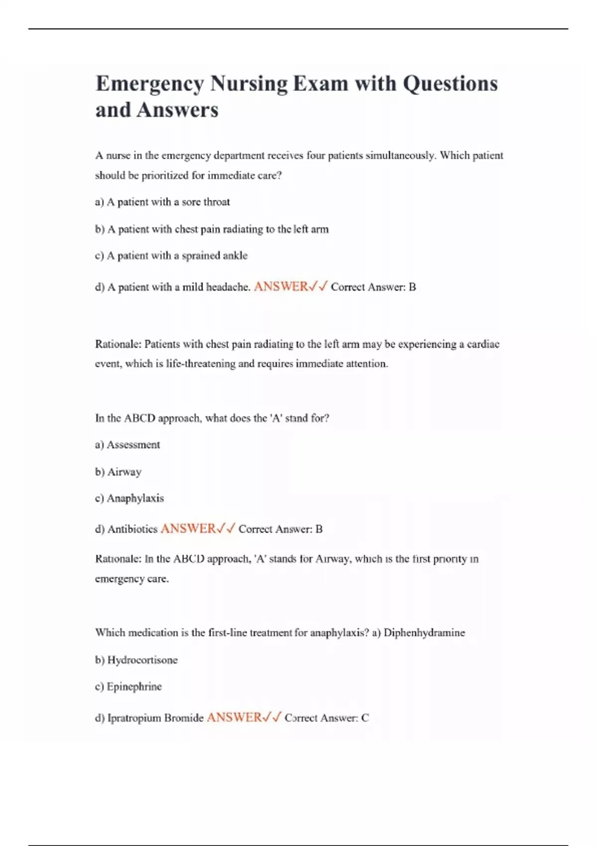 Emergency Nursing Exam with Questions and Answers A nurse in the emergency department receives four patients simultaneously. Which patient should be prioritized for immediate care? a) A patient with a sore throat b) A patient with chest pain radiating to the left arm c) A patient with a sprained ankle d) A patient with a mild headache. ANSWER Correct Answer: B Rationale: Patients with chest pain radiating to the left arm may be experiencing a cardiac event, which is life-threatening and requires immediate attention. In the ABCD approach, what does the 'A' stand for? a) Assessment b) Airway c) Anaphylaxis d) Antibiotics ANSWER Correct Answer: B Rationale: In the ABCD approach, 'A' stands for Airway, which is the first priority in emergency care. Which medication is the first-line treatment for anaphylaxis? a) Diphenhydramine b) Hydrocortisone c) Epinephrine d) Ipratropium Bromide ANSWER Correct Answer: C