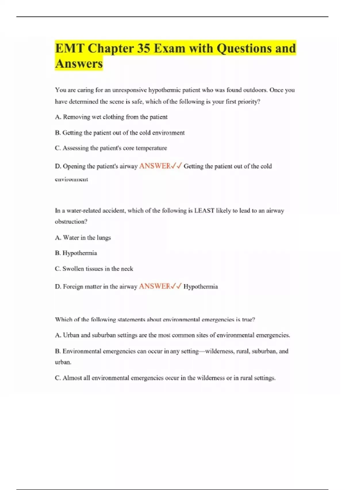 EMT Chapter 35 Exam with Questions and Answers You are caring for an unresponsive hypothermic patient who was found outdoors. Once you have determined the scene is safe, which of the following is your first priority? A. Removing wet clothing from the patient B. Getting the patient out of the cold environment C. Assessing the patient's core temperature D. Opening the patient's airway ANSWER Getting the patient out of the cold environment In a water-related accident, which of the following is LEAST likely to lead to an airway obstruction? A. Water in the lungs B. Hypothermia C. Swollen tissues in the neck D. Foreign matter in the airway ANSWER Hypothermia Which of the following statements about environmental emergencies is true? A. Urban and suburban settings are the most common sites of environmental emergencies. B. Environmental emergencies can occur in any setting—wilderness, rural, suburban, and urban. C. Almost all environmental emergencies occur in the wilderness or in rural settings. D. Very few environmental emergencies occur in wilderness, rural, suburban, or urban settings. ANSWER Environmental emergencies can occur in any setting—wilderness, rural, suburban, and urban.