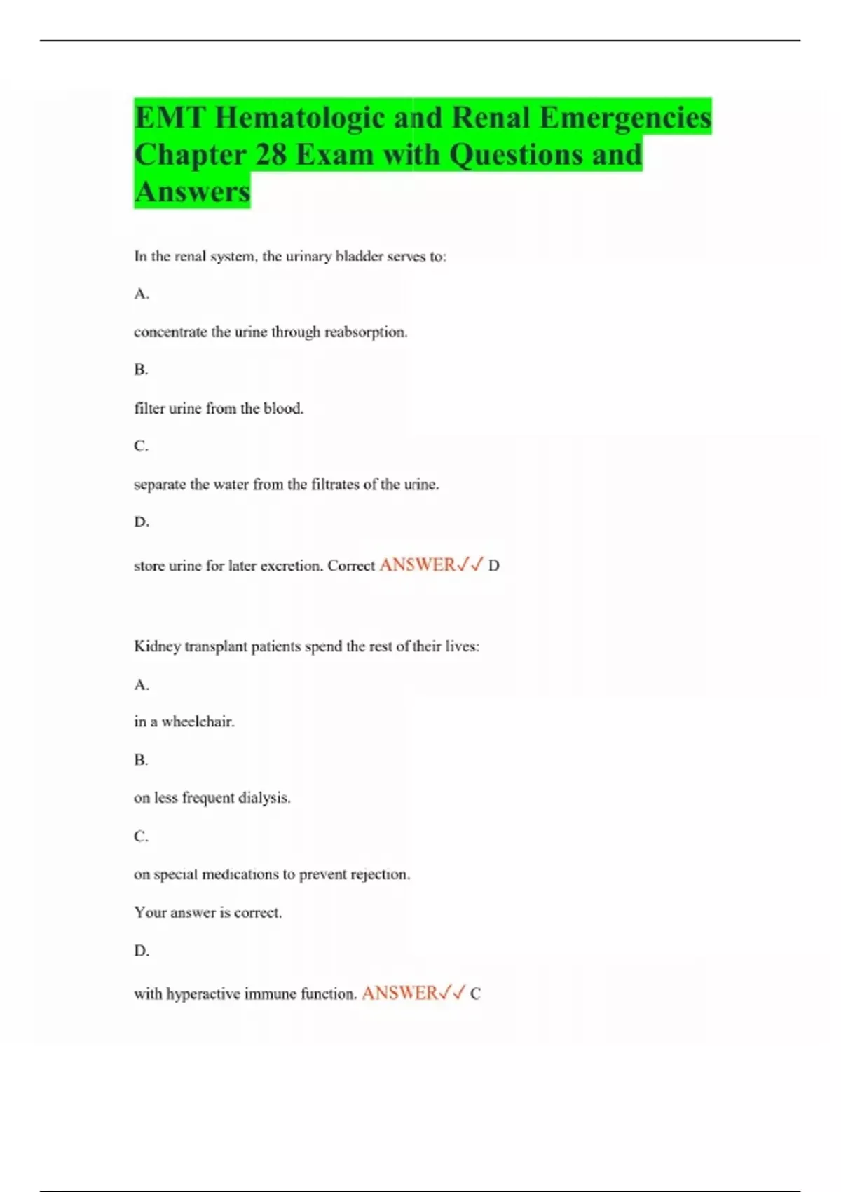 EMT Hematologic and Renal Emergencies Chapter 28 Exam with Questions and Answers In the renal system, the urinary bladder serves to: A. concentrate the urine through reabsorption. B. filter urine from the blood. C. separate the water from the filtrates of the urine. D. store urine for later excretion. Correct ANSWER D Kidney transplant patients spend the rest of their lives: A. in a wheelchair. B. on less frequent dialysis. C. on special medications to prevent rejection. Your answer is correct. D. with hyperactive immune function. ANSWER C Abnormal red blood cells in patients with sickle cell disease, when microscopically enlarged, look like: A. semicircular crescents. Your answer is correct. B. large, thin rings. C. doughnuts, including a hole in the center. D. doughnuts with a depression rather than a hole in the center. ANSWER A