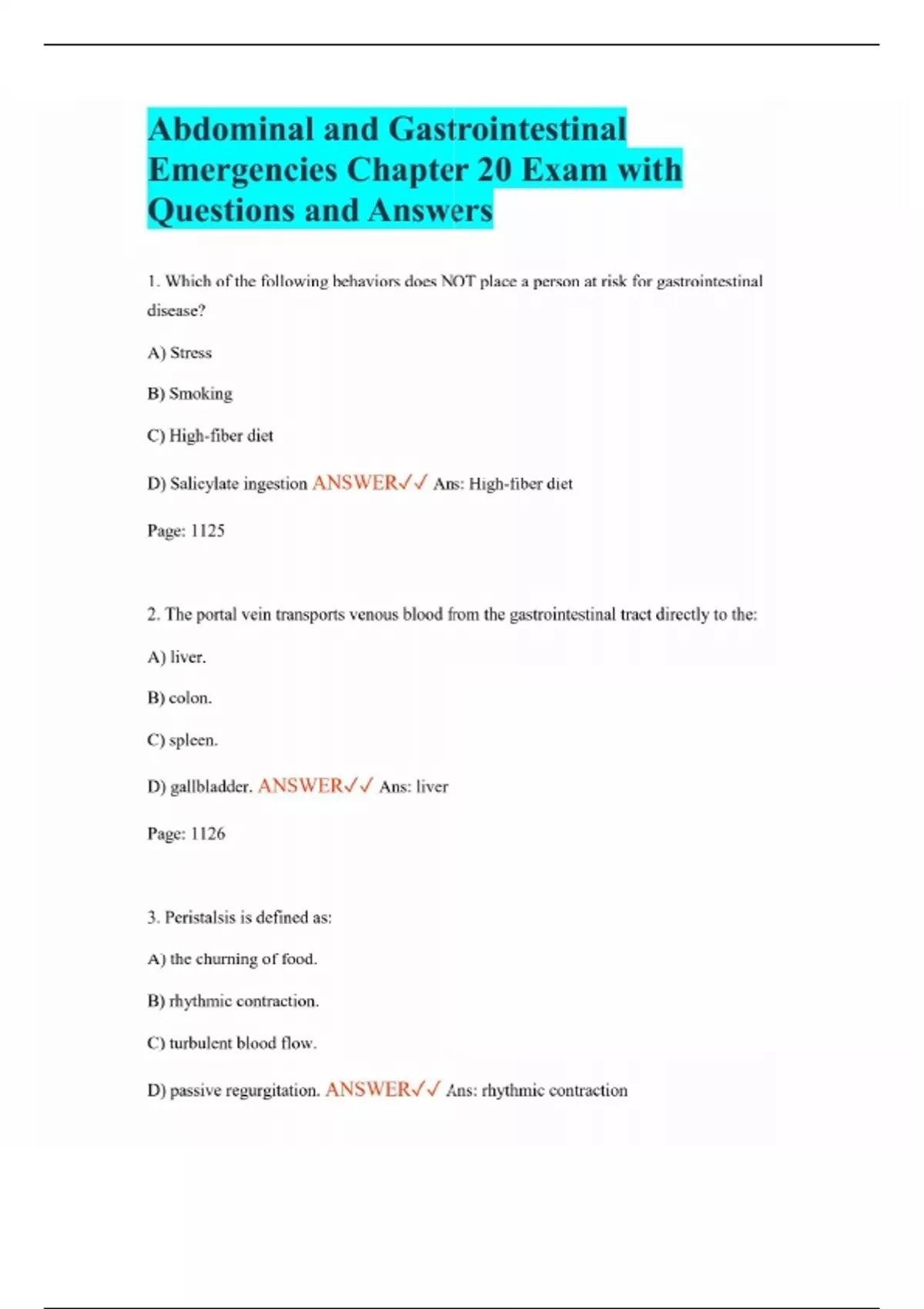 Abdominal and Gastrointestinal Emergencies Chapter 20 Exam with Questions and Answers 1. Which of the following behaviors does NOT place a person at risk for gastrointestinal disease? A) Stress B) Smoking C) High-fiber diet D) Salicylate ingestion ANSWER Ans: High-fiber diet Page: 1125 2. The portal vein transports venous blood from the gastrointestinal tract directly to the: A) liver. B) colon. C) spleen. D) gallbladder. ANSWER Ans: liver Page: 1126 3. Peristalsis is defined as: A) the churning of food. B) rhythmic contraction. C) turbulent blood flow. D) passive regurgitation. ANSWER Ans: rhythmic contraction