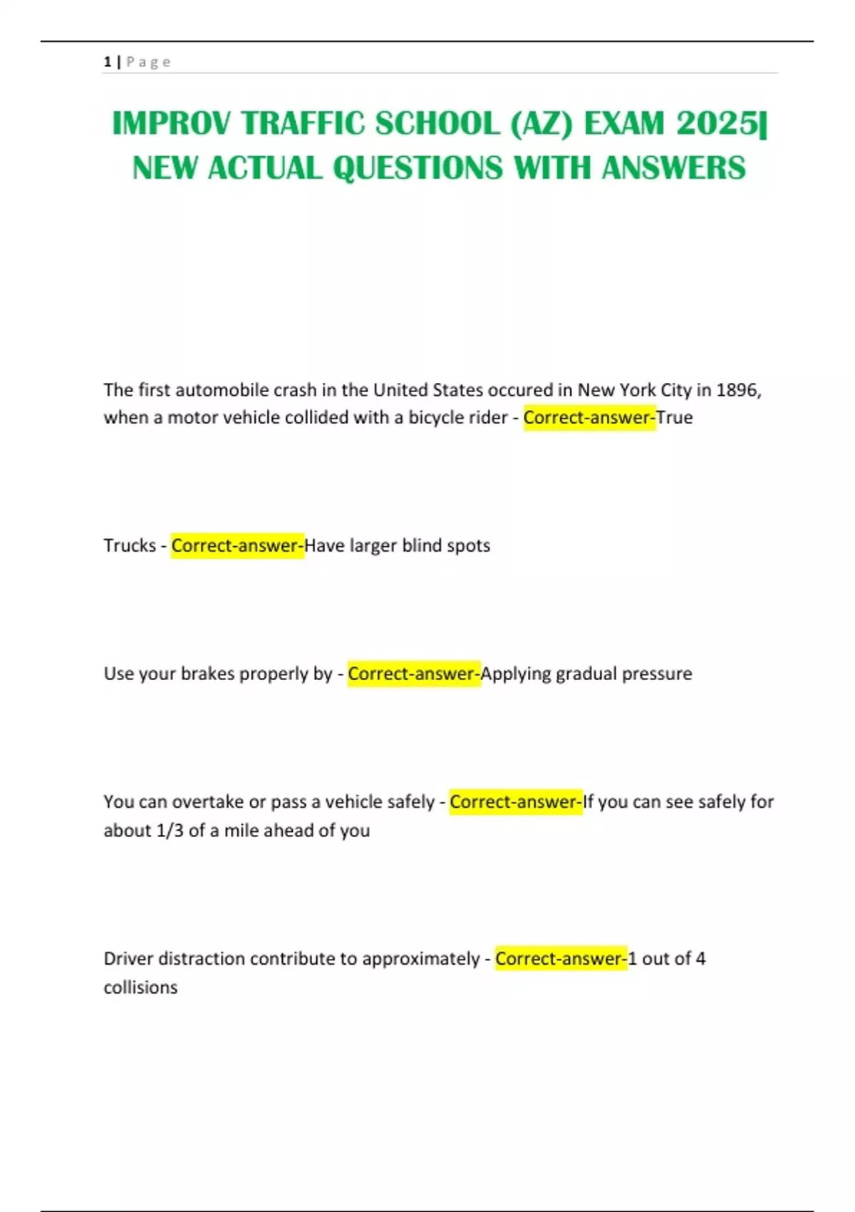 IMPROV TRAFFIC SCHOOL (AZ) EXAM 2025| NEW ACTUAL QUESTIONS WITH ANSWERS