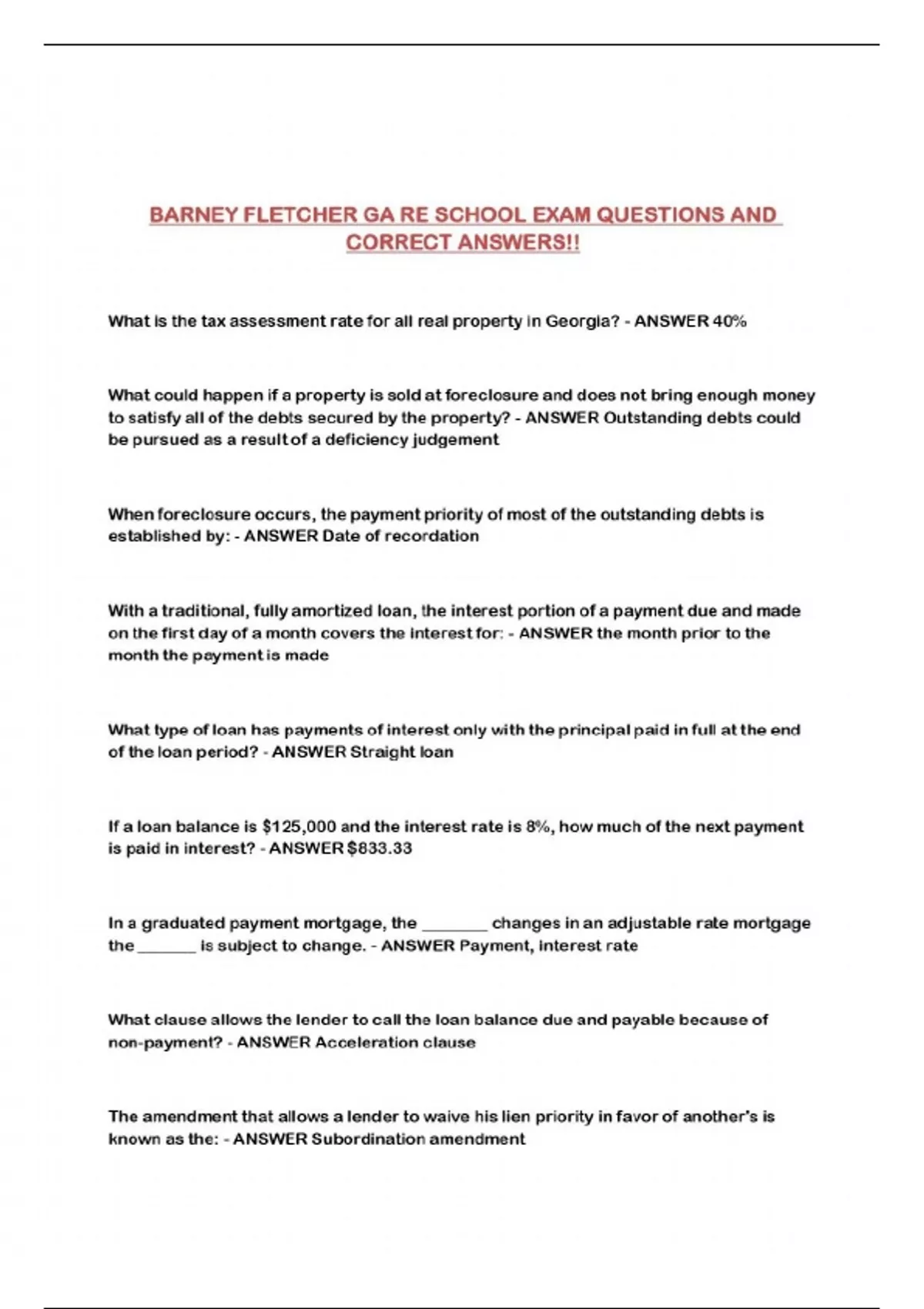 BARNEY FLETCHER GA RE SCHOOL EXAM QUESTIONS AND CORRECT ANSWERS!!...