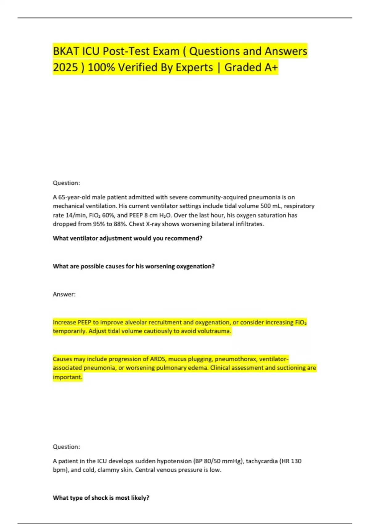 A patient in the ICU develops sudden hypotension (BP 80/50 mmHg), tachycardia (HR 130
