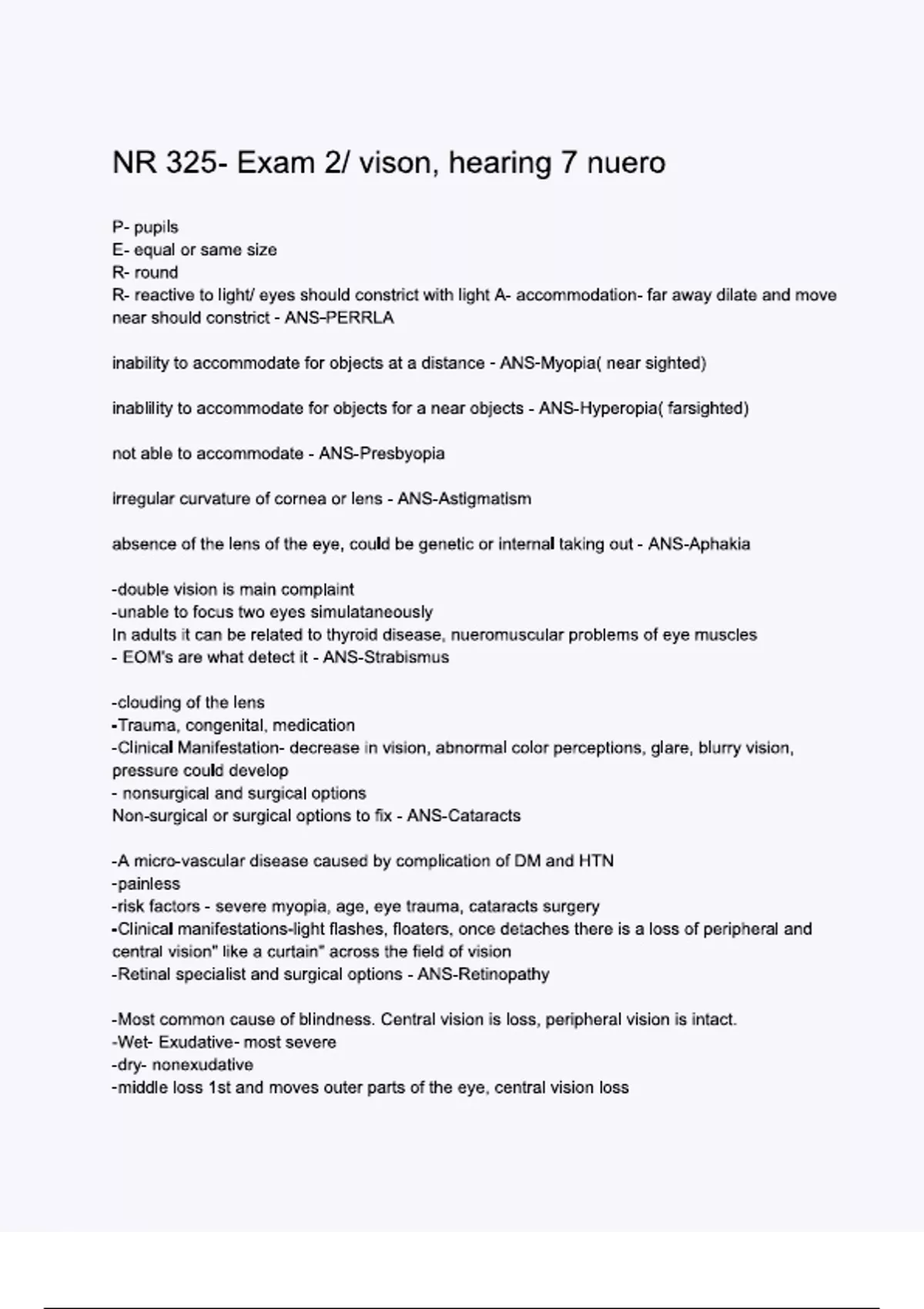 NR 325 Exam 2 vison, hearing 7 nuero questions and answers: {LATEST 2025/ 2026 UPDATE} COMPLETE REAL AND AUTHENTIC EXAM {100% CORRECT} RATED A+!!!!