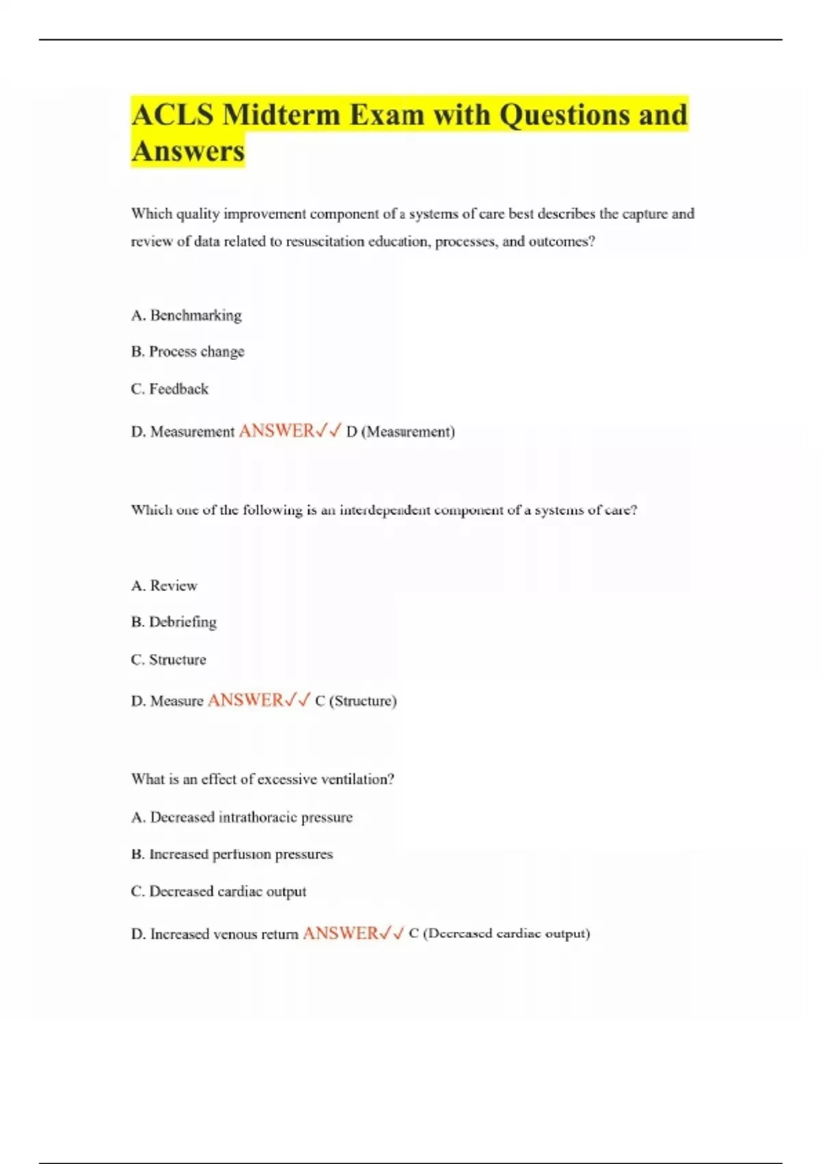 ACLS Midterm Exam with Questions and Answers Which quality improvement component of a systems of care best describes the capture and review of data related to resuscitation education, processes, and outcomes? A. Benchmarking B. Process change C. Feedback D. Measurement ANSWER D (Measurement) Which one of the following is an interdependent component of a systems of care? A. Review B. Debriefing C. Structure D. Measure ANSWER C (Structure) What is an effect of excessive ventilation? A. Decreased intrathoracic pressure B. Increased perfusion pressures C. Decreased cardiac output D. Increased venous return ANSWER C (Decreased cardiac output)