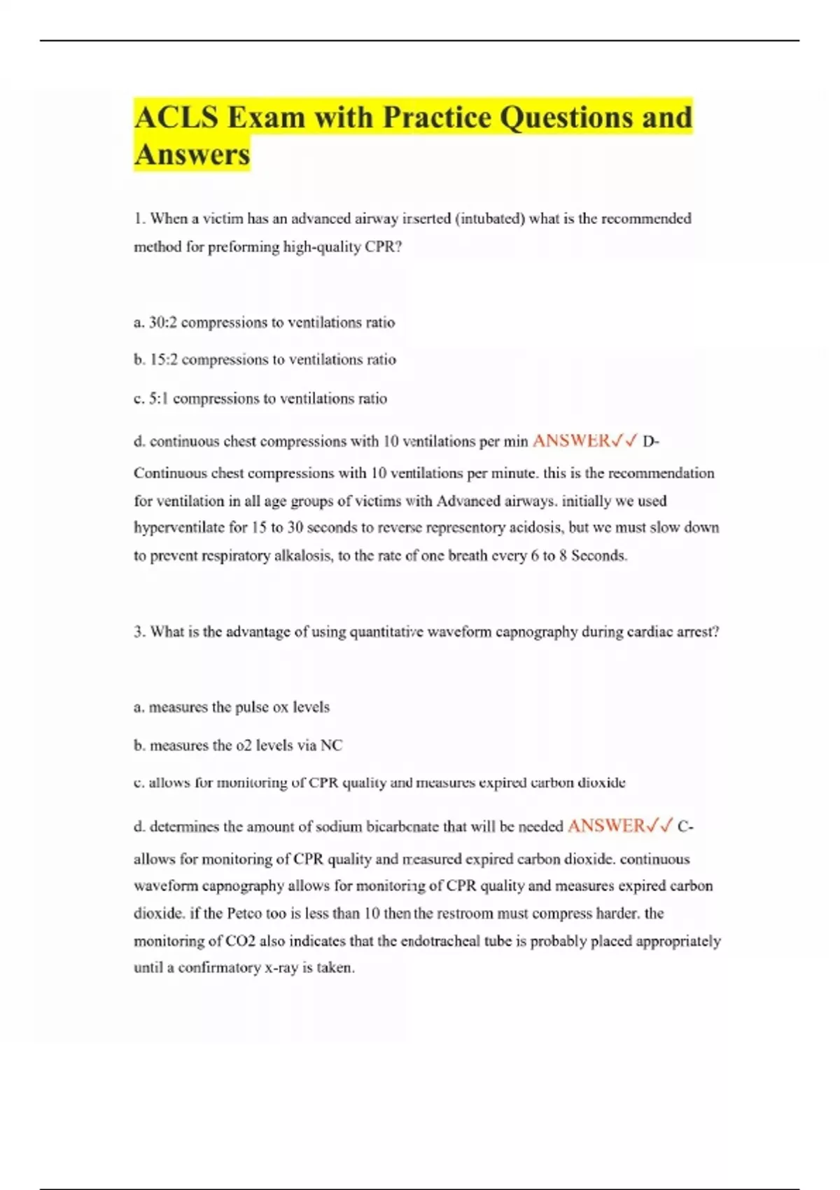 ACLS Exam with Practice Questions and Answers 1. When a victim has an advanced airway inserted (intubated) what is the recommended method for preforming high-quality CPR? a. 30:2 compressions to ventilations ratio b. 15:2 compressions to ventilations ratio c. 5:1 compressions to ventilations ratio d. continuous chest compressions with 10 ventilations per min ANSWER D- Continuous chest compressions with 10 ventilations per minute. this is the recommendation for ventilation in all age groups of victims with Advanced airways. initially we used hyperventilate for 15 to 30 seconds to reverse representory acidosis, but we must slow down to prevent respiratory alkalosis, to the rate of one breath every 6 to 8 Seconds. 3. What is the advantage of using quantitative waveform capnography during cardiac arrest? a. measures the pulse ox levels b. measures the o2 levels via NC c. allows for monitoring of CPR quality and measures expired carbon dioxide d. determines the amount of sodium bicarbonate that will be needed ANSWER C- allows for monitoring of CPR quality and measured expired carbon dioxide. continuous waveform capnography allows for monitoring of CPR quality and measures expired carbon dioxide. if the Petco too is less than 10 then the restroom must compress harder. the monitoring of CO2 also indicates that the endotracheal tube is probably placed appropriately until a confirmatory x-ray is taken.