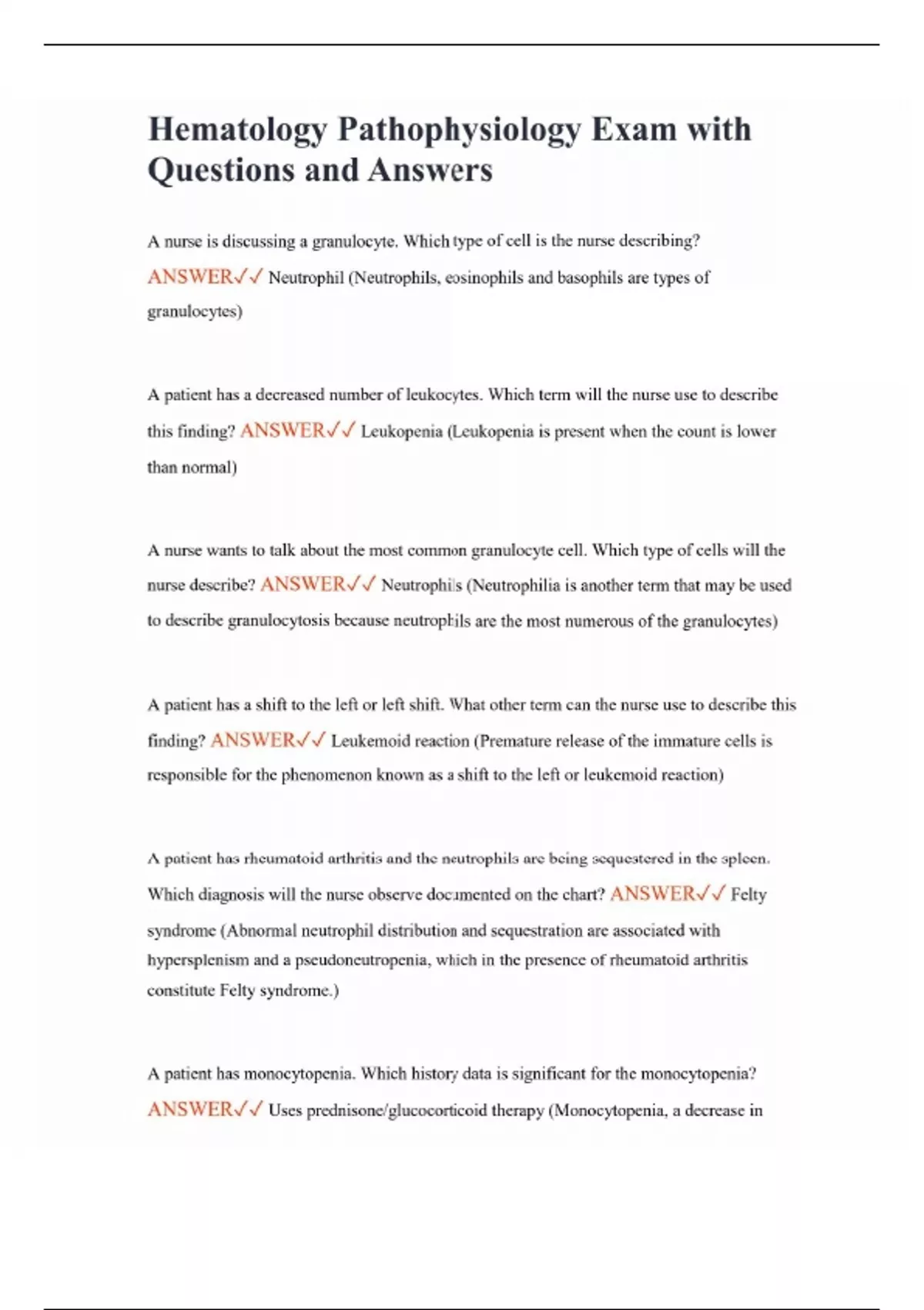 Hematology Pathophysiology Exam with Questions and Answers A nurse is discussing a granulocyte. Which type of cell is the nurse describing? ANSWER Neutrophil (Neutrophils, eosinophils and basophils are types of granulocytes) A patient has a decreased number of leukocytes. Which term will the nurse use to describe this finding? ANSWER Leukopenia (Leukopenia is present when the count is lower than normal) A nurse wants to talk about the most common granulocyte cell. Which type of cells will the nurse describe? ANSWER Neutrophils (Neutrophilia is another term that may be used to describe granulocytosis because neutrophils are the most numerous of the granulocytes) A patient has a shift to the left or left shift. What other term can the nurse use to describe this finding? ANSWER Leukemoid reaction (Premature release of the immature cells is responsible for the phenomenon known as a shift to the left or leukemoid reaction) A patient has rheumatoid arthritis and the neutrophils are being sequestered in the spleen. Which diagnosis will the nurse observe documented on the chart? ANSWER Felty syndrome (Abnormal neutrophil distribution and sequestration are associated with hypersplenism and a pseudoneutropenia, which in the presence of rheumatoid arthritis constitute Felty syndrome.) A patient has monocytopenia. Which history data is significant for the monocytopenia? ANSWER Uses prednisone/glucocorticoid therapy (Monocytopenia, a decrease in