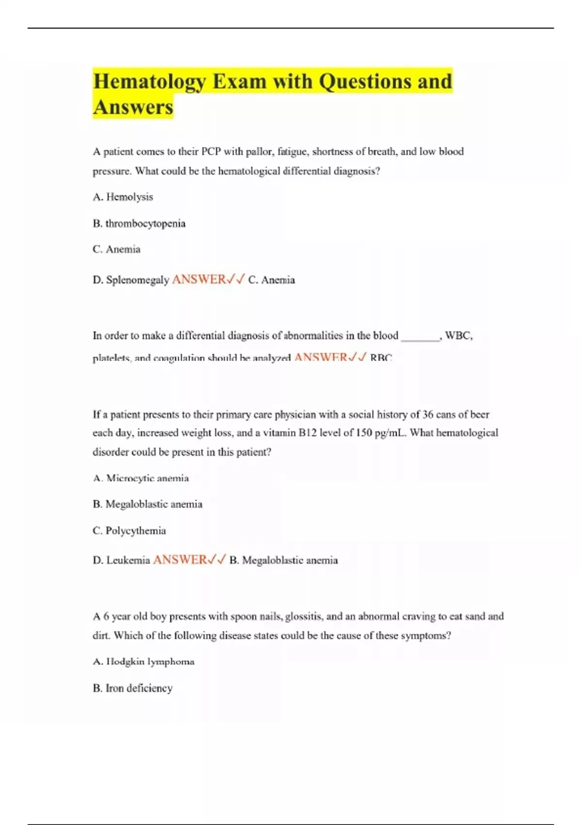 Hematology Exam with Questions and Answers A patient comes to their PCP with pallor, fatigue, shortness of breath, and low blood pressure. What could be the hematological differential diagnosis? A. Hemolysis B. thrombocytopenia C. Anemia D. Splenomegaly ANSWER C. Anemia In order to make a differential diagnosis of abnormalities in the blood _______, WBC, platelets, and coagulation should be analyzed ANSWER RBC If a patient presents to their primary care physician with a social history of 36 cans of beer each day, increased weight loss, and a vitamin B12 level of 150 pg/mL. What hematological disorder could be present in this patient? A. Microcytic anemia B. Megaloblastic anemia C. Polycythemia D. Leukemia ANSWER B. Megaloblastic anemia A 6 year old boy presents with spoon nails, glossitis, and an abnormal craving to eat sand and dirt. Which of the following disease states could be the cause of these symptoms? A. Hodgkin lymphoma B. Iron deficiency