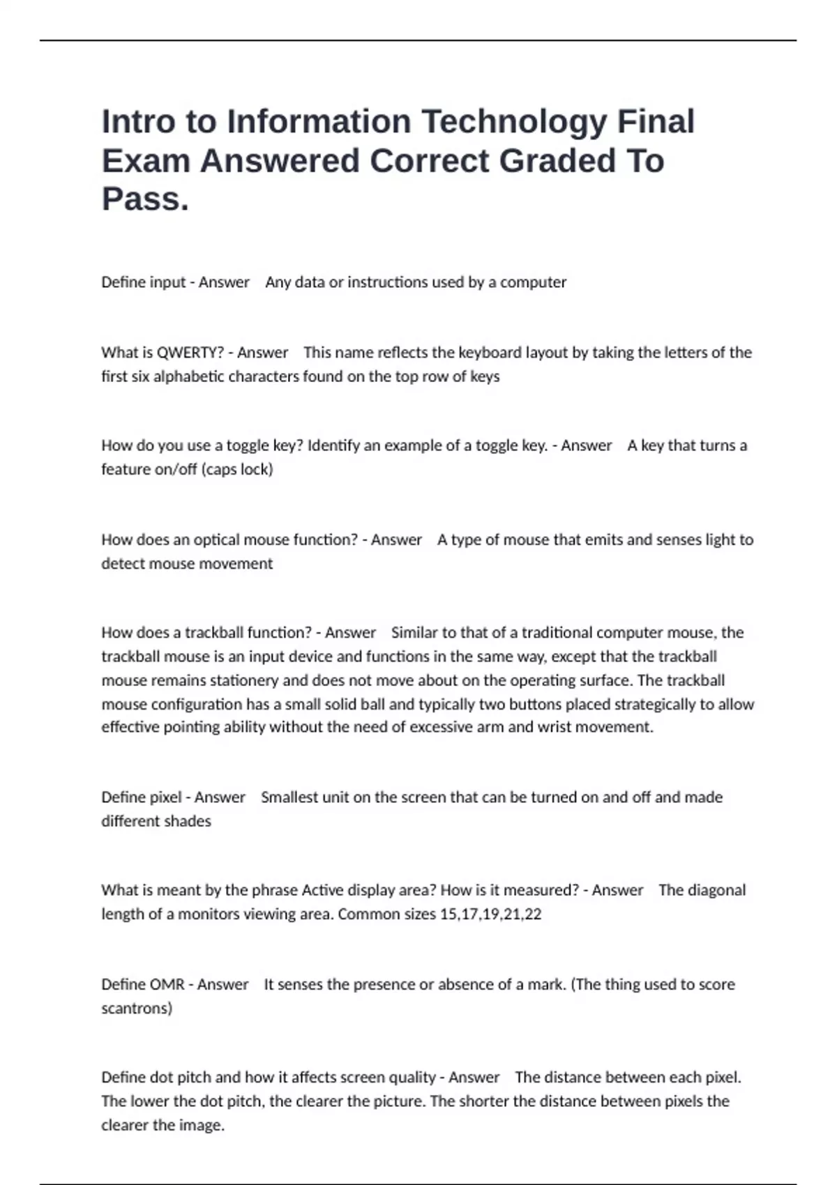 Define input - Answer Any data or instructions used by a computer What is QWERTY? - Answer This name reflects the keyboard layout by taking the letters of the first six alphabetic characters found on the top row of keys How do you use a toggle key? Identify an example of a toggle key. - Answer A key that turns a feature on/off (caps lock) How does an optical mouse function? - Answer A type of mouse that emits and senses light to detect mouse movement How does a trackball function? - Answer Similar to that of a traditional computer mouse, the trackball mouse is an input device and functions in the same way, except that the trackball mouse remains stationery and does not move about on the operating surface. The trackball mouse configuration has a small solid ball and typically two buttons placed strategically to allow effective pointing ability without the need of excessive arm and wrist movement. Define pixel - Answer Smallest unit on the screen that can be turned on and off and made different shades What is meant by the phrase Active display area? How is it measured? - Answer The diagonal length of a monitors viewing area. Common sizes 15,17,19,21,22 Define OMR - Answer It senses the presence or absence of a mark. (The thing used to score scantrons) Define dot pitch and how it affects screen quality - Answer The distance between each pixel. The lower the dot pitch, the clearer the picture. The shorter the distance between pixels the clearer the image. What is the purpose of bar code readers? How do they work? - Answer Photo electric scanner that reads barcodes for processing.