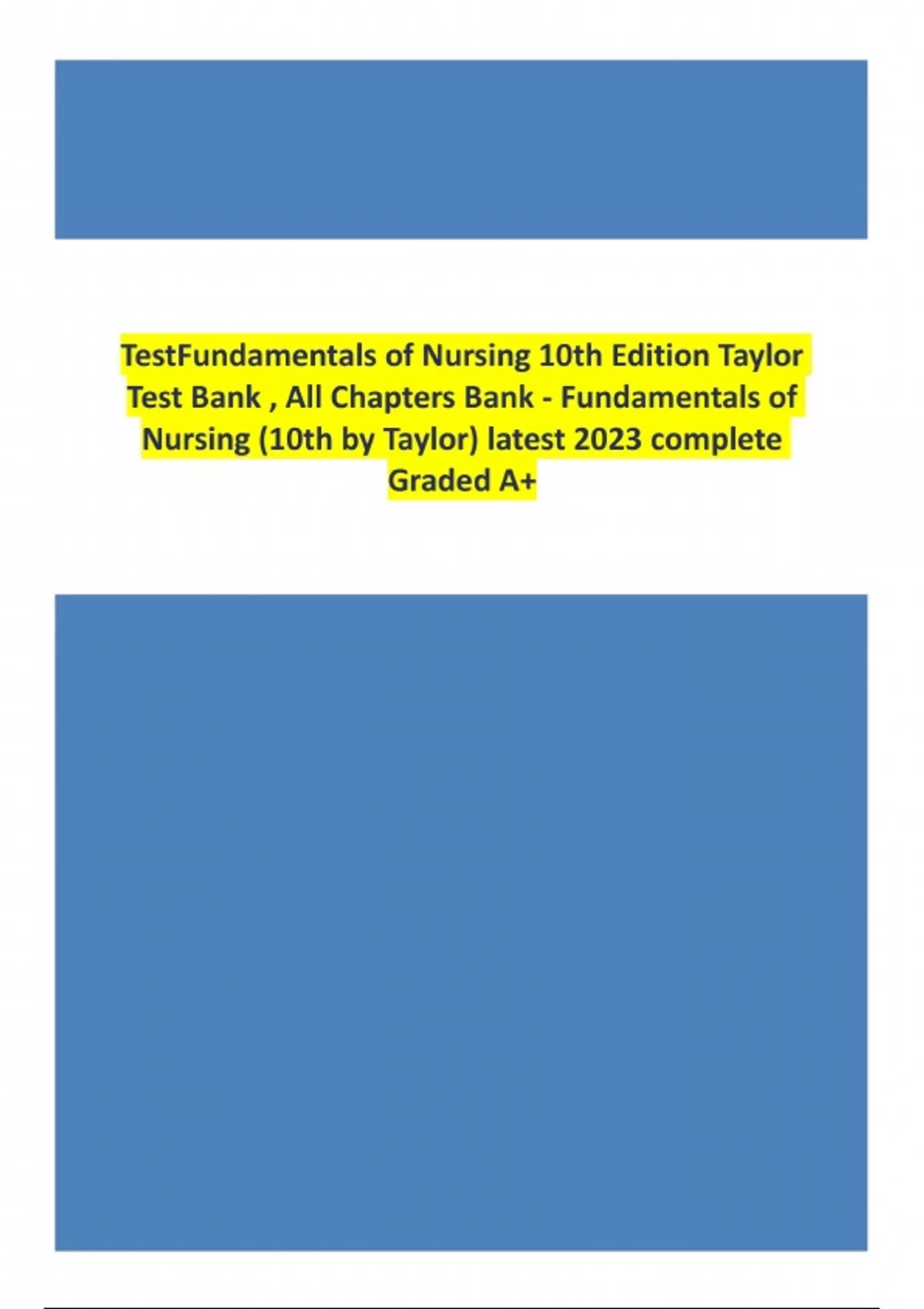 Download the official Test Bank for Fundamentals of Nursing, 10th Edition by Carol Taylor, Pamela Lynn, and Jennifer Bartlett. This comprehensive NCLEX-style test bank includes accurate multiple-choice questions and answers covering essential nursing concepts, critical thinking, patient care, and foundational skills. Perfect for nursing students preparing for exams and clinical practice.