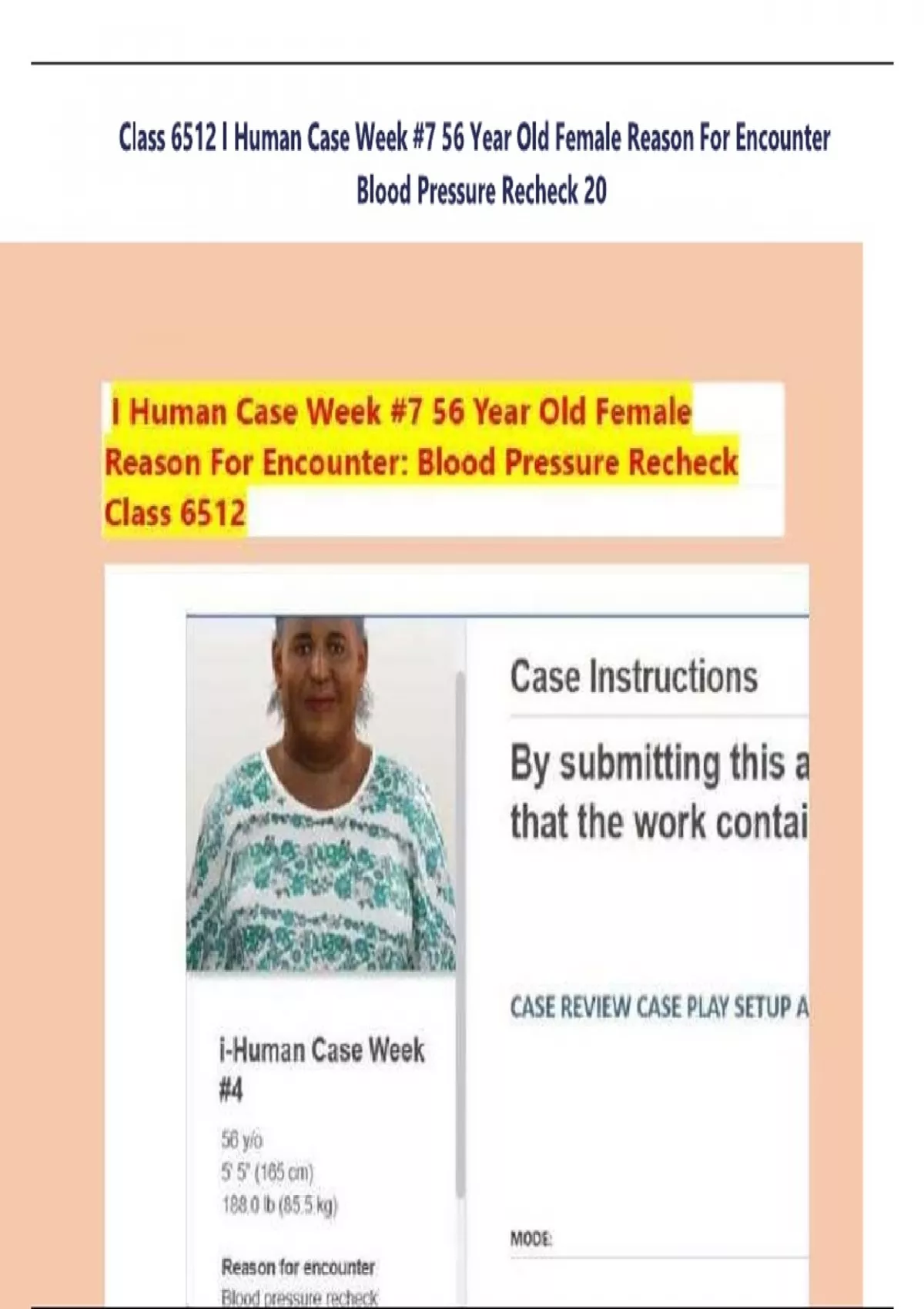 Class 6512 I Human Case Week #7 56 Year Old Female Reason For Encounter Blood Pressure Recheck 20 Class 6512 I Human Case Week #7 56 Year Old Female Reason For Encounter Blood Pressure Recheck 20 Class 6512 I Human Case Week #7 56 Year Old Female Reason For Encounter Blood Pressure Recheck 20