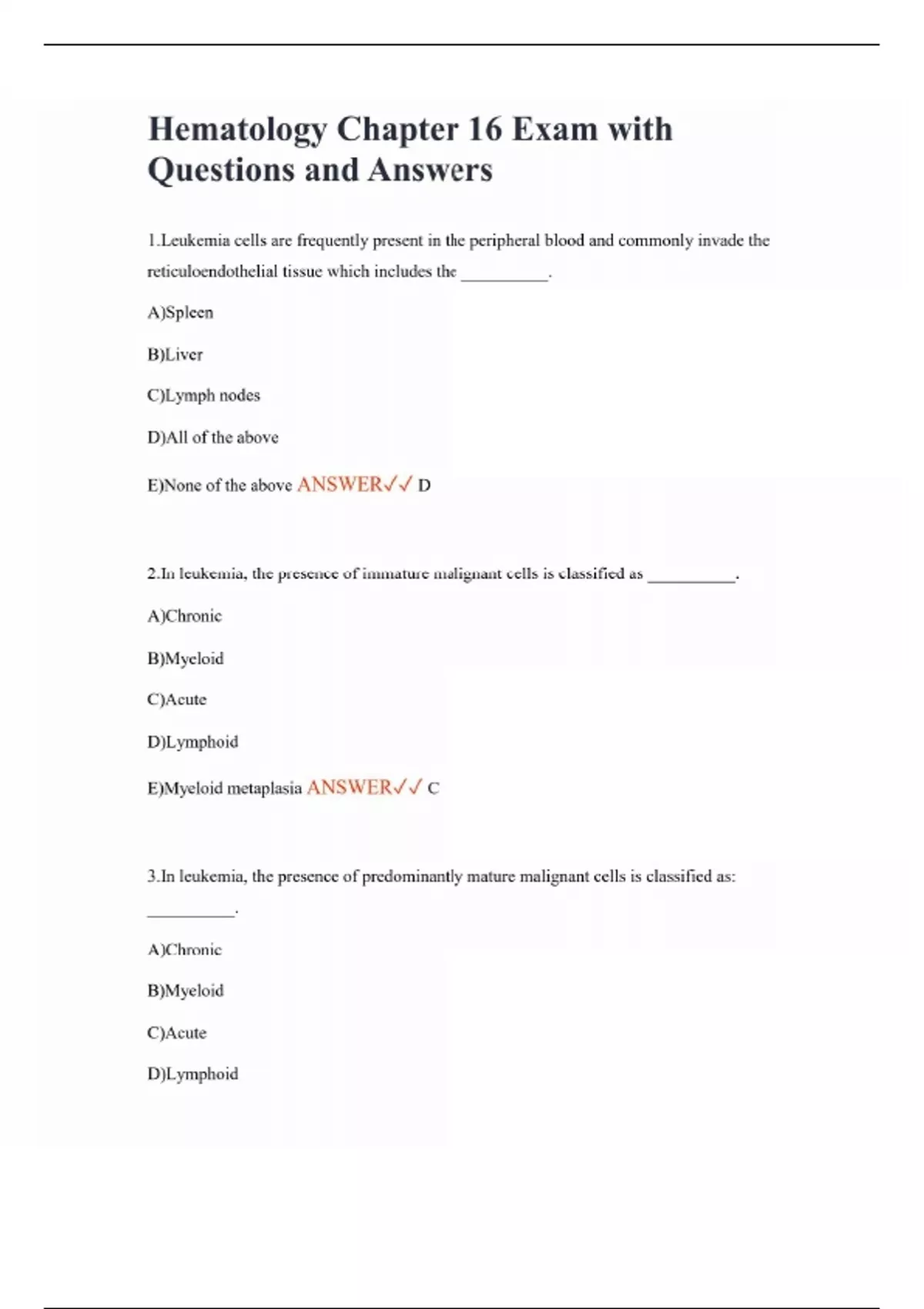 Hematology Chapter 16 Exam with Questions and Answers 1.Leukemia cells are frequently present in the peripheral blood and commonly invade the reticuloendothelial tissue which includes the __________. A)Spleen B)Liver C)Lymph nodes D)All of the above E)None of the above ANSWER D 2.In leukemia, the presence of immature malignant cells is classified as __________. A)Chronic B)Myeloid C)Acute D)Lymphoid E)Myeloid metaplasia ANSWER C 3.In leukemia, the presence of predominantly mature malignant cells is classified as: __________. A)Chronic B)Myeloid C)Acute D)Lymphoid