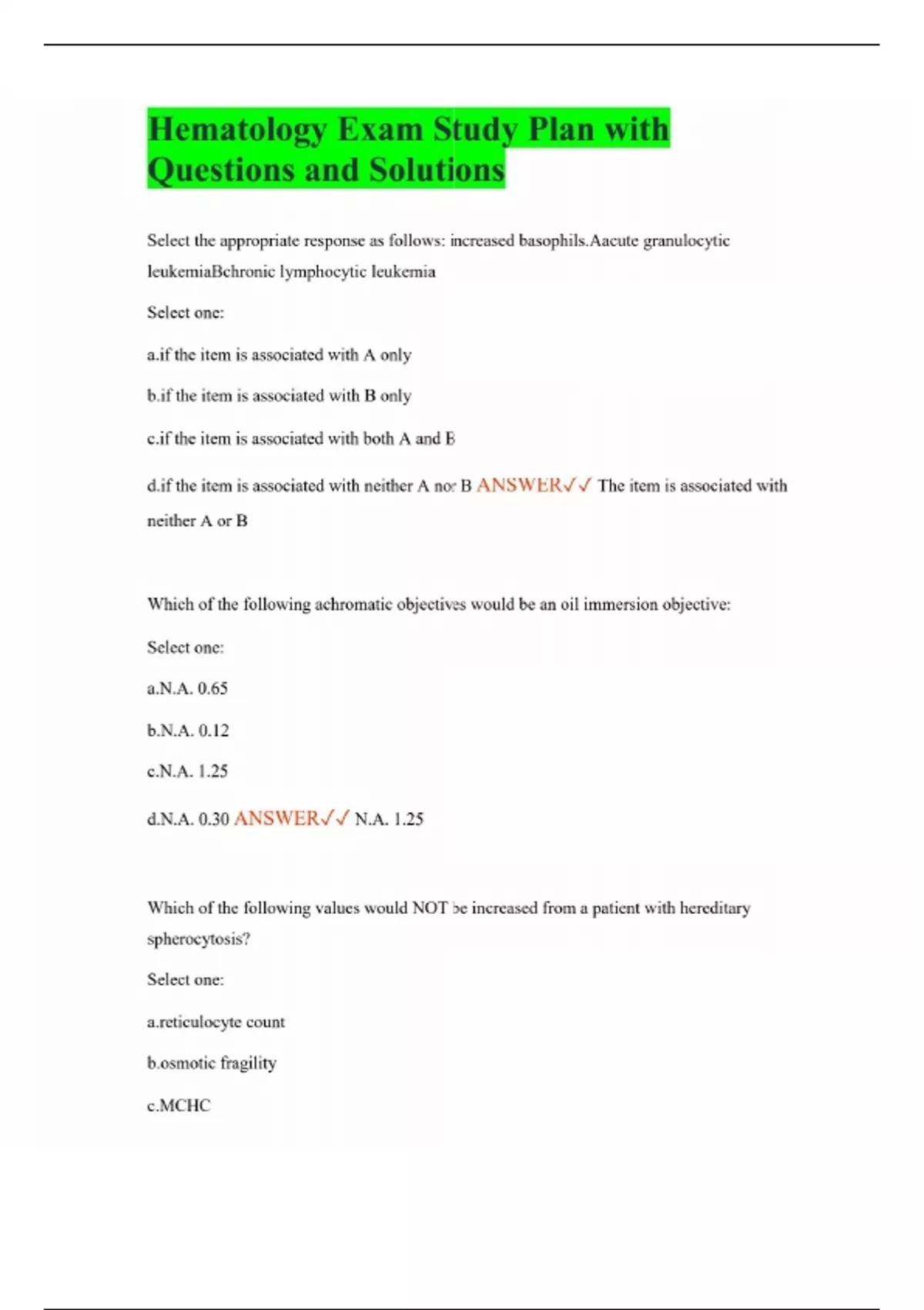 Hematology Exam Study Plan with Questions and Solutions Select the appropriate response as follows: increased basophils.Aacute granulocytic leukemiaBchronic lymphocytic leukemia Select one: the item is associated with A only the item is associated with B only the item is associated with both A and B the item is associated with neither A nor B ANSWER The item is associated with neither A or B Which of the following achromatic objectives would be an oil immersion objective: Select one: a.N.A. 0.65 b.N.A. 0.12 c.N.A. 1.25 d.N.A. 0.30 ANSWER N.A. 1.25 Which of the following values would NOT be increased from a patient with hereditary spherocytosis? Select one: ulocyte count ic fragility c.MCHC cell count ANSWER Red cell count