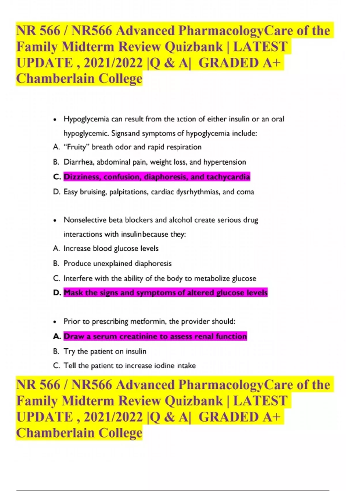 NR 566 - NR566 Advanced Pharmacology Care of the Family Midterm Review Quiz bank LATEST UPDATE , 2023 Q & A GRADED A+ Chamberlain College