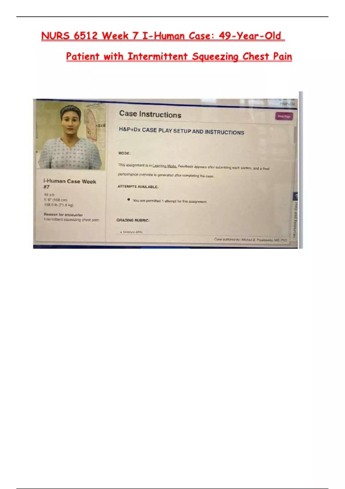 NURS 6512 Week 7 I-Human Case 49-Year-Old Patient with Intermittent Squeezing Chest Pain NURS 6512 Week 7 I-Human Case 49-Year-Old Patient with Intermittent Squeezing Chest Pain
