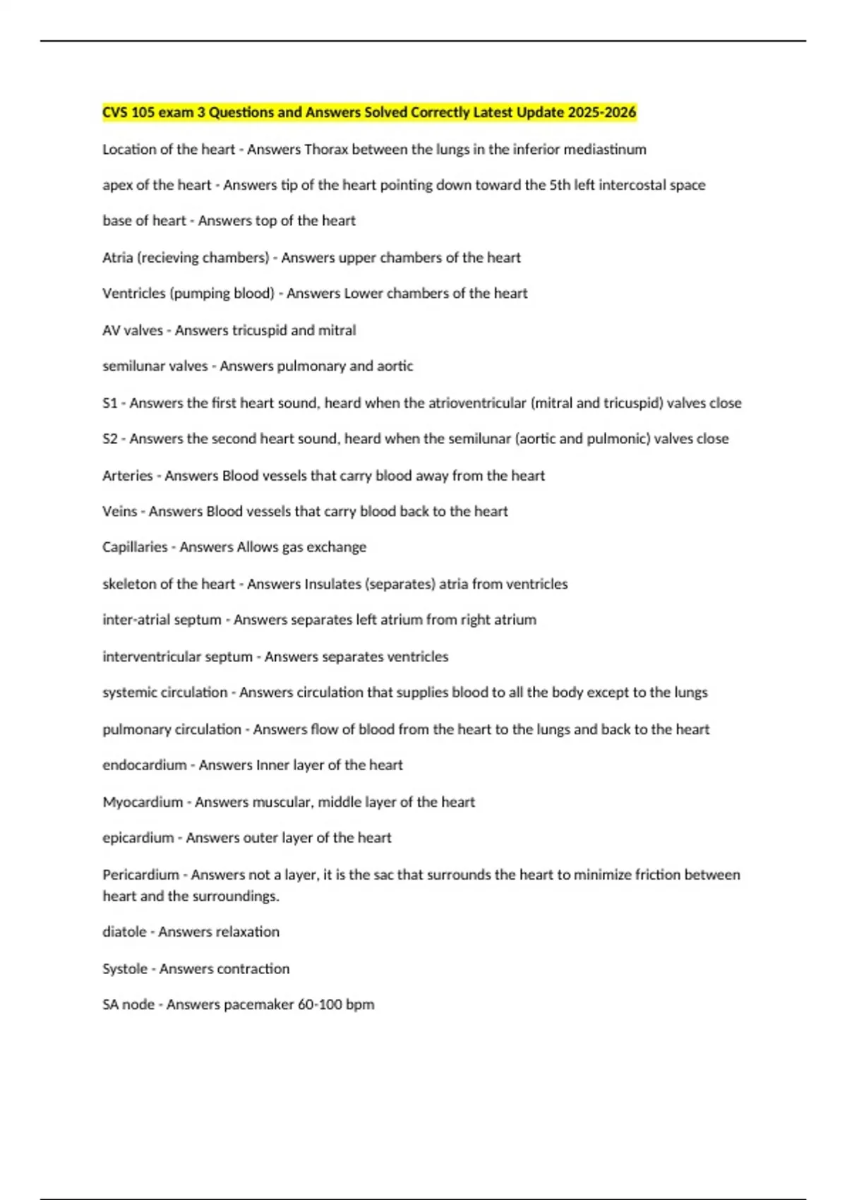 CVS 105 exam 3 Questions and Answers Solved Correctly Latest Update Location of the heart - Answers Thorax between the lungs in the inferior mediastinum apex of the heart - Answers tip of the heart pointing down toward the 5th left intercostal space base of heart - Answers top of the heart Atria (recieving chambers) - Answers upper chambers of the heart Ventricles (pumping blood) - Answers Lower chambers of the heart AV valves - Answers tricuspid and mitral semilunar valves - Answers pulmonary and aortic S1 - Answers the first heart sound, heard when the atrioventricular (mitral and tricuspid) valves close S2 - Answers the second heart sound, heard when the semilunar (aortic and pulmonic) valves close Arteries - Answers Blood vessels that carry blood away from the heart Veins - Answers Blood vessels that carry blood back to the heart Capillaries - Answers Allows gas exchange skeleton of the heart - Answers Insulates (separates) atria from ventricles inter-atrial septum - Answers separates left atrium from right atrium interventricular septum - Answers separates ventricles systemic circulation - Answers circulation that supplies blood to all the body except to the lungs pulmonary circulation - Answers flow of blood from the heart to the lungs and back to the heart endocardium - Answers Inner layer of the heart Myocardium - Answers muscular, middle layer of the heart epicardium - Answers outer layer of the heart