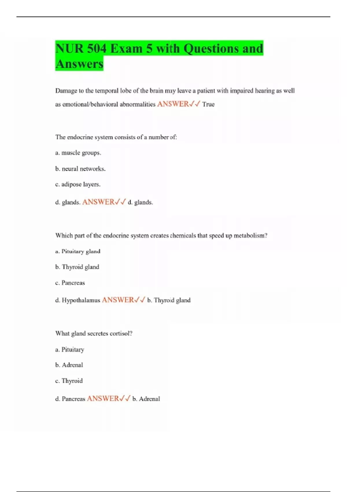 NUR 504 Exam 5 with Questions and Answers Damage to the temporal lobe of the brain may leave a patient with impaired hearing as well as emotional/behavioral abnormalities ANSWER True The endocrine system consists of a number of: a. muscle groups. b. neural networks. c. adipose layers. d. glands. ANSWER d. glands. Which part of the endocrine system creates chemicals that speed up metabolism? a. Pituitary gland b. Thyroid gland c. Pancreas d. Hypothalamus ANSWER b. Thyroid gland What gland secretes cortisol? a. Pituitary b. Adrenal c. Thyroid d. Pancreas ANSWER b. Adrenal