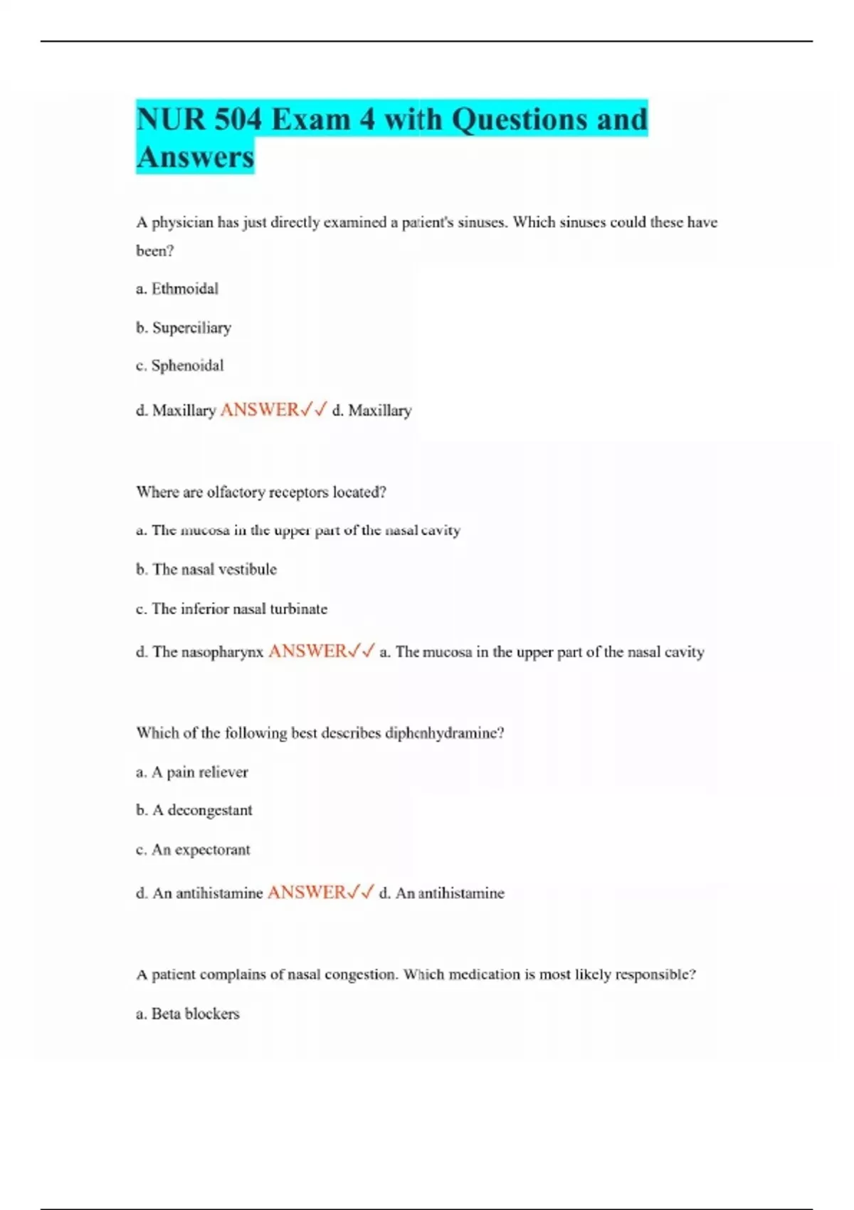 NUR 504 Exam 4 with Questions and Answers A physician has just directly examined a patient's sinuses. Which sinuses could these have been? a. Ethmoidal b. Superciliary c. Sphenoidal d. Maxillary ANSWER d. Maxillary Where are olfactory receptors located? a. The mucosa in the upper part of the nasal cavity b. The nasal vestibule c. The inferior nasal turbinate d. The nasopharynx ANSWER a. The mucosa in the upper part of the nasal cavity Which of the following best describes diphenhydramine? a. A pain reliever b. A decongestant c. An expectorant d. An antihistamine ANSWER d. An antihistamine A patient complains of nasal congestion. Which medication is most likely responsible? a. Beta blockers