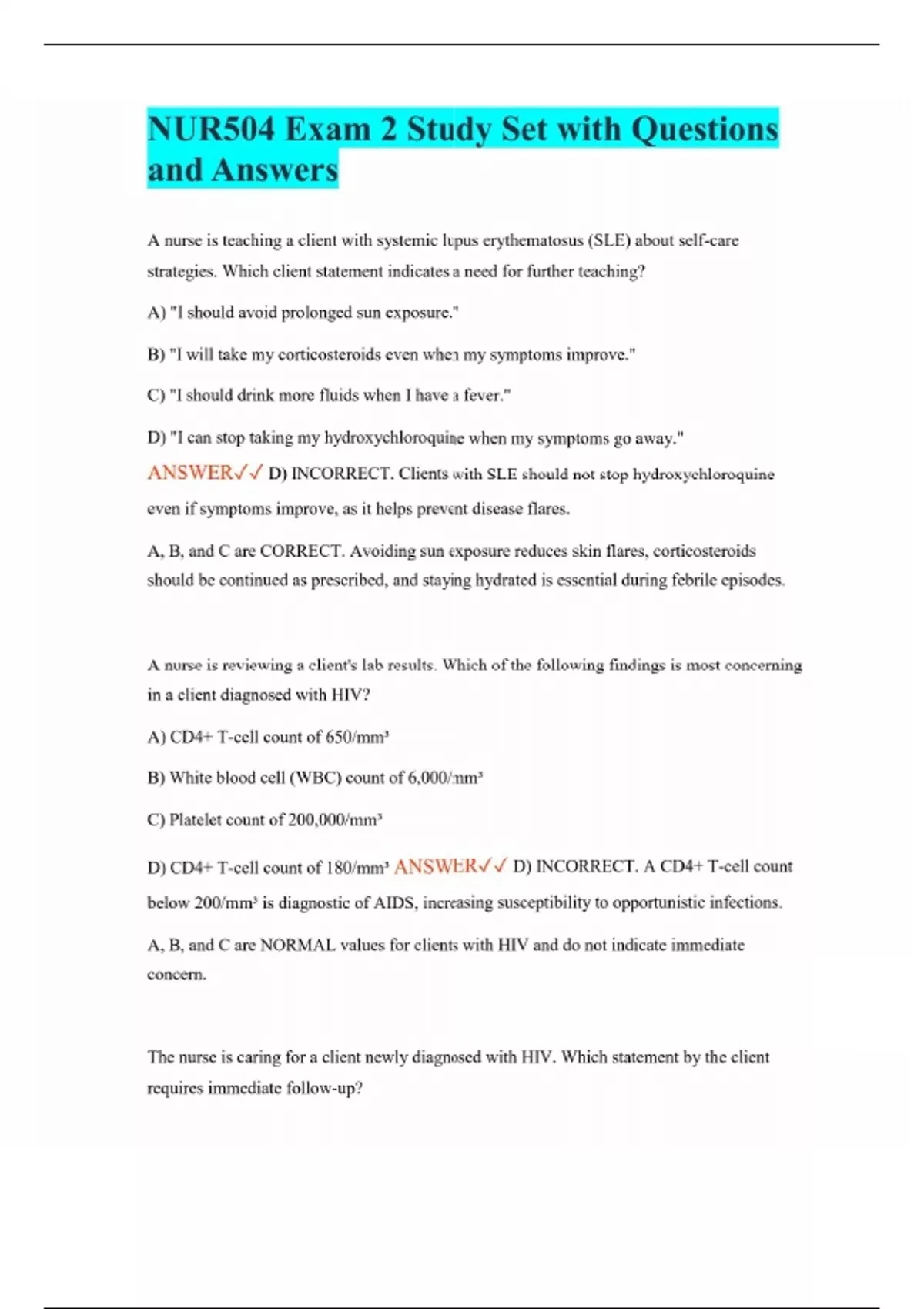 NUR 504 Exam 2 Study Set with Questions and Answers A nurse is teaching a client with systemic lupus erythematosus (SLE) about self-care strategies. Which client statement indicates a need for further teaching? A) "I should avoid prolonged sun exposure." B) "I will take my corticosteroids even when my symptoms improve." C) "I should drink more fluids when I have a fever." D) "I can stop taking my hydroxychloroquine when my symptoms go away." ANSWER D) INCORRECT. Clients with SLE should not stop hydroxychloroquine even if symptoms improve, as it helps prevent disease flares. A, B, and C are CORRECT. Avoiding sun exposure reduces skin flares, corticosteroids should be continued as prescribed, and staying hydrated is essential during febrile episodes. A nurse is reviewing a client's lab results. Which of the following findings is most concerning in a client diagnosed with HIV? A) CD4+ T-cell count of 650/mm³ B) White blood cell (WBC) count of 6,000/mm³ C) Platelet count of 200,000/mm³ D) CD4+ T-cell count of 180/mm³ ANSWER D) INCORRECT. A CD4+ T-cell count below 200/mm³ is diagnostic of AIDS, increasing susceptibility to opportunistic infections. A, B, and C are NORMAL values for clients with HIV and do not indicate immediate concern. The nurse is caring for a client newly diagnosed with HIV. Which statement by the client requires immediate follow-up?