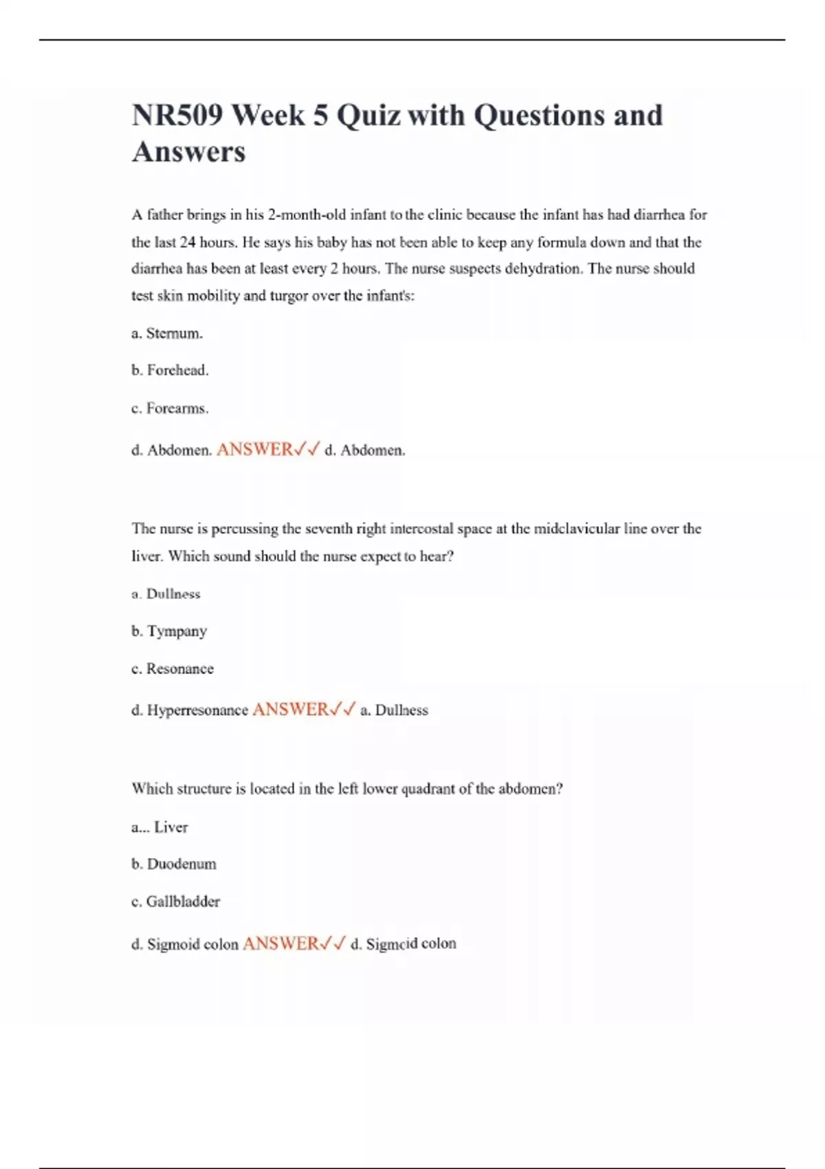 NR509 Week 5 Quiz with Questions and Answers A father brings in his 2-month-old infant to the clinic because the infant has had diarrhea for the last 24 hours. He says his baby has not been able to keep any formula down and that the diarrhea has been at least every 2 hours. The nurse suspects dehydration. The nurse should test skin mobility and turgor over the infant's: a. Sternum. b. Forehead. c. Forearms. d. Abdomen. ANSWER d. Abdomen. The nurse is percussing the seventh right intercostal space at the midclavicular line over the liver. Which sound should the nurse expect to hear? a. Dullness b. Tympany c. Resonance d. Hyperresonance ANSWER a. Dullness Which structure is located in the left lower quadrant of the abdomen? a... Liver b. Duodenum c. Gallbladder d. Sigmoid colon ANSWER d. Sigmoid colon