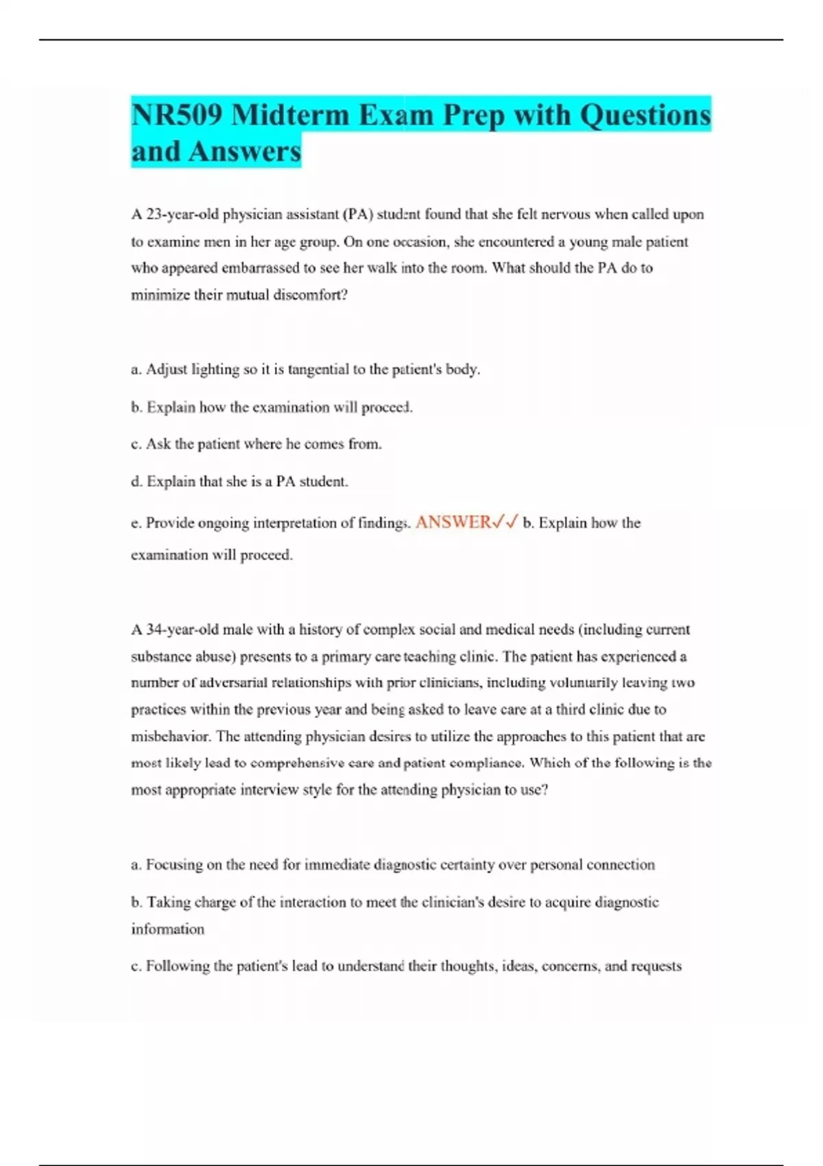 NR509 Midterm Exam Prep with Questions and Answers A 23-year-old physician assistant (PA) student found that she felt nervous when called upon to examine men in her age group. On one occasion, she encountered a young male patient who appeared embarrassed to see her walk into the room. What should the PA do to minimize their mutual discomfort? a. Adjust lighting so it is tangential to the patient's body. b. Explain how the examination will proceed. c. Ask the patient where he comes from. d. Explain that she is a PA student. e. Provide ongoing interpretation of findings. ANSWER b. Explain how the examination will proceed. A 34-year-old male with a history of complex social and medical needs (including current substance abuse) presents to a primary care teaching clinic. The patient has experienced a number of adversarial relationships with prior clinicians, including voluntarily leaving two practices within the previous year and being asked to leave care at a third clinic due to misbehavior. The attending physician desires to utilize the approaches to this patient that are most likely lead to comprehensive care and patient compliance. Which of the following is the most appropriate interview style for the attending physician to use? a. Focusing on the need for immediate diagnostic certainty over personal connection b. Taking charge of the interaction to meet the clinician's desire to acquire diagnostic information c. Following the patient's lead to understand their thoughts, ideas, concerns, and requests d. Deferring respect, empathy, ANSWER c. Following the patient's lead to understand their thoughts, ideas, concerns, and requests