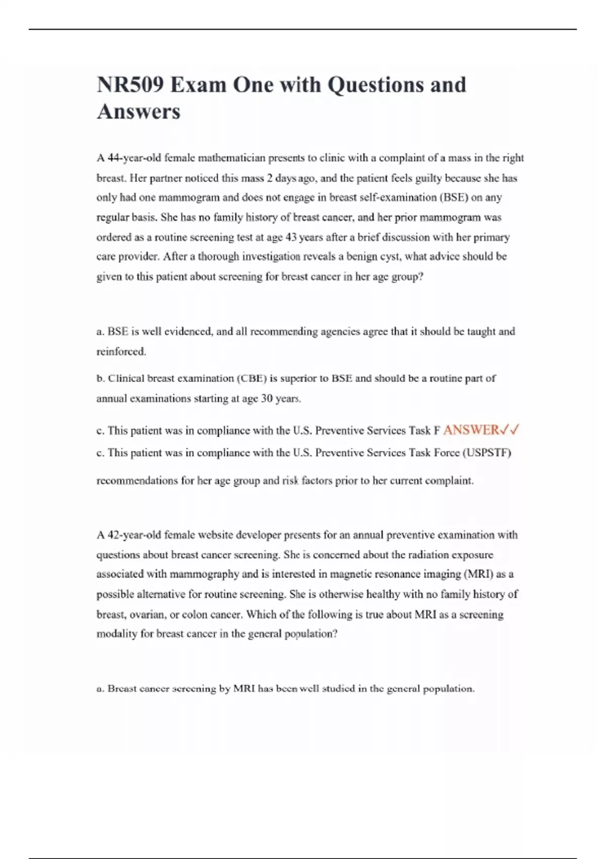 NR509 Exam One with Questions and Answers A 44-year-old female mathematician presents to clinic with a complaint of a mass in the right breast. Her partner noticed this mass 2 days ago, and the patient feels guilty because she has only had one mammogram and does not engage in breast self-examination (BSE) on any regular basis. She has no family history of breast cancer, and her prior mammogram was ordered as a routine screening test at age 43 years after a brief discussion with her primary care provider. After a thorough investigation reveals a benign cyst, what advice should be given to this patient about screening for breast cancer in her age group? a. BSE is well evidenced, and all recommending agencies agree that it should be taught and reinforced. b. Clinical breast examination (CBE) is superior to BSE and should be a routine part of annual examinations starting at age 30 years. c. This patient was in compliance with the U.S. Preventive Services Task F ANSWER c. This patient was in compliance with the U.S. Preventive Services Task Force (USPSTF) recommendations for her age group and risk factors prior to her current complaint. A 42-year-old female website developer presents for an annual preventive examination with questions about breast cancer screening. She is concerned about the radiation exposure associated with mammography and is interested in magnetic resonance imaging (MRI) as a possible alternative for routine screening. She is otherwise healthy with no family history of breast, ovarian, or colon cancer. Which of the following is true about MRI as a screening modality for breast cancer in the general population? a. Breast cancer screening by MRI has been well studied in the general population.