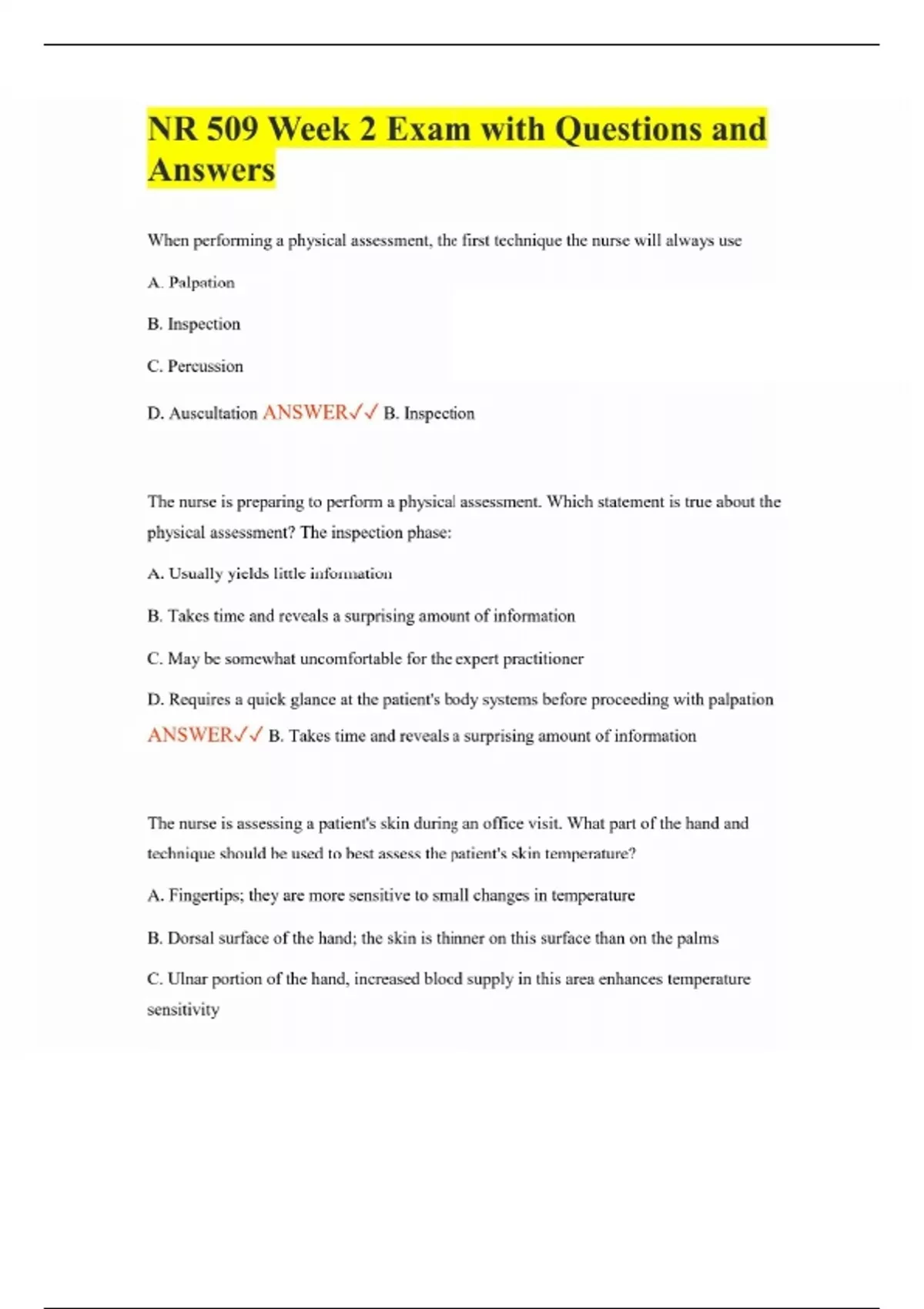 NR 509 Week 2 Exam with Questions and Answers When performing a physical assessment, the first technique the nurse will always use A. Palpation B. Inspection C. Percussion D. Auscultation ANSWER B. Inspection The nurse is preparing to perform a physical assessment. Which statement is true about the physical assessment? The inspection phase: A. Usually yields little information B. Takes time and reveals a surprising amount of information C. May be somewhat uncomfortable for the expert practitioner D. Requires a quick glance at the patient's body systems before proceeding with palpation ANSWER B. Takes time and reveals a surprising amount of information The nurse is assessing a patient's skin during an office visit. What part of the hand and technique should be used to best assess the patient's skin temperature? A. Fingertips; they are more sensitive to small changes in temperature B. Dorsal surface of the hand; the skin is thinner on this surface than on the palms C. Ulnar portion of the hand, increased blood supply in this area enhances temperature sensitivity