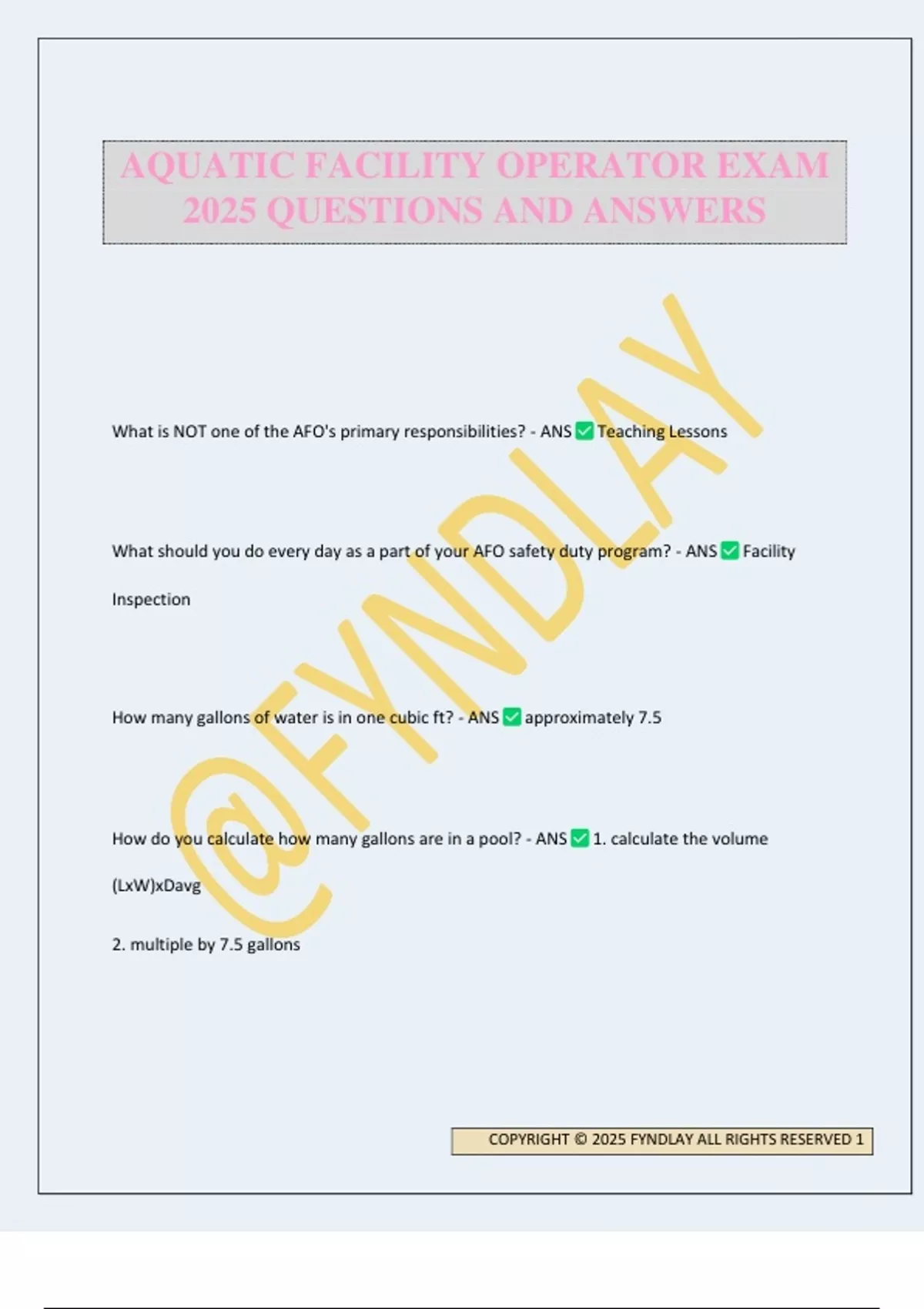 What is NOT one of the AFO's primary responsibilities? - ANS Teaching Lessons What should you do every day as a part of your AFO safety duty program? - ANS Facility Inspection How many gallons of water is in one cubic ft? - ANS approximately 7.5 How do you calculate how many gallons are in a pool? - ANS 1. calculate the volume (LxW)xDavg 2. multiple by 7.5 gallons AQUATIC FACILITY OPERATOR EXAM 2025 QUESTIONS AND ANSWERS COPYRIGHT © 2025 FYNDLAY ALL RIGHTS RESERVED 2 Law of Dilution - ANS During a turnover less than half of the water molecules pass through the filter What kind of pools need a higher turnover? - ANS Special pools When do gutters NOT work? - ANS when flooded What do surge pits need? - ANS room to contain surge flow What do modulating float valves regulate? - ANS the amount of water contributed by the bottom outlet by slowly restricting the bottom drain valve as the water level in the surge pit rises What are the two types of pumps? - ANS Self-Priming and Flooded Suction Centrifugal 4 inches = - ANS 400 gpm