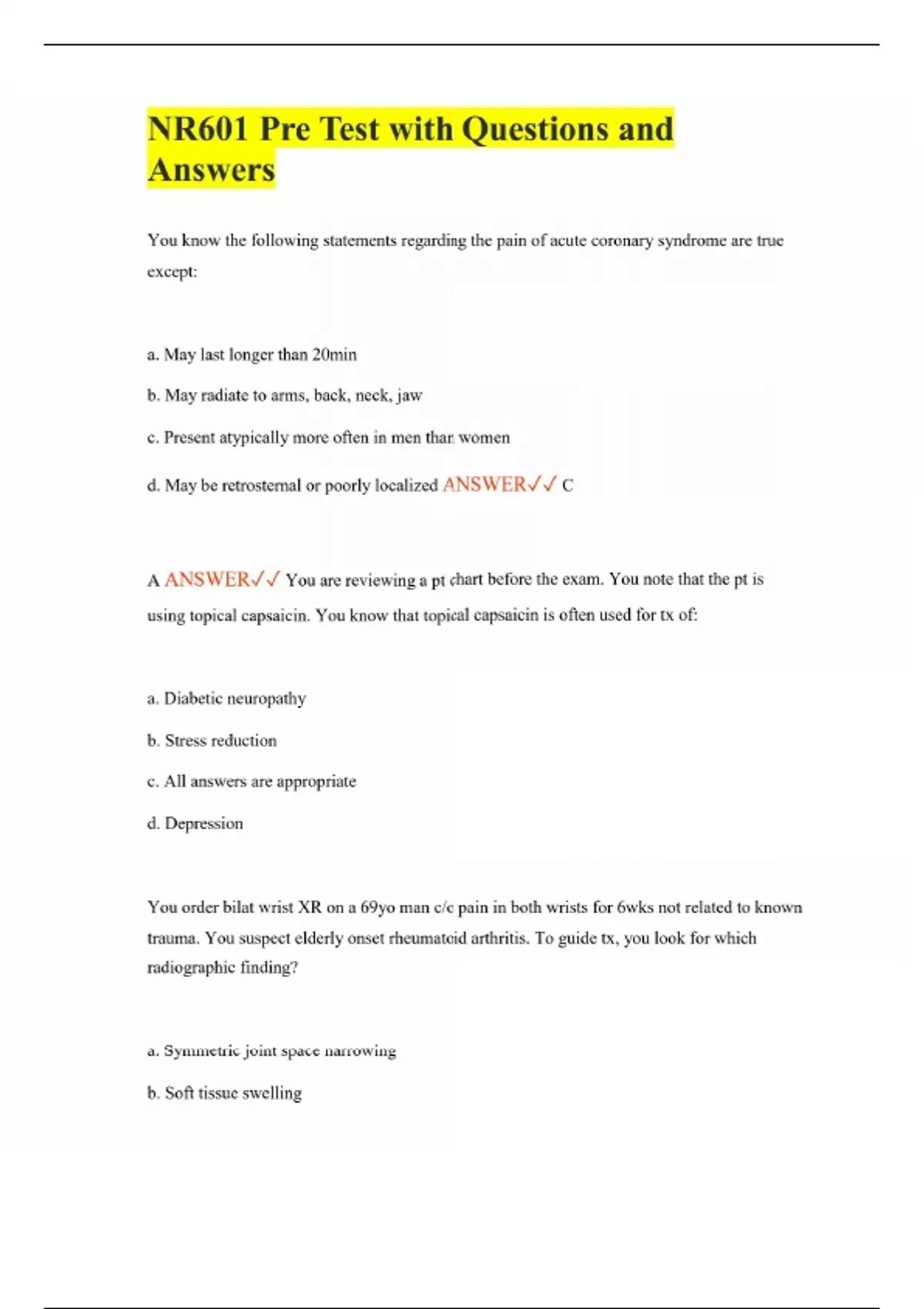 NR601 Pre Test with Questions and Answers You know the following statements regarding the pain of acute coronary syndrome are true except: a. May last longer than 20min b. May radiate to arms, back, neck, jaw c. Present atypically more often in men than women d. May be retrosternal or poorly localized ANSWER C A ANSWER You are reviewing a pt chart before the exam. You note that the pt is using topical capsaicin. You know that topical capsaicin is often used for tx of: a. Diabetic neuropathy b. Stress reduction c. All answers are appropriate d. Depression You order bilat wrist XR on a 69yo man c/o pain in both wrists for 6wks not related to known trauma. You suspect elderly onset rheumatoid arthritis. To guide tx, you look for which radiographic finding? a. Symmetric joint space narrowing b. Soft tissue swelling c. Subluxation of joints d. Joint erosions ANSWER D