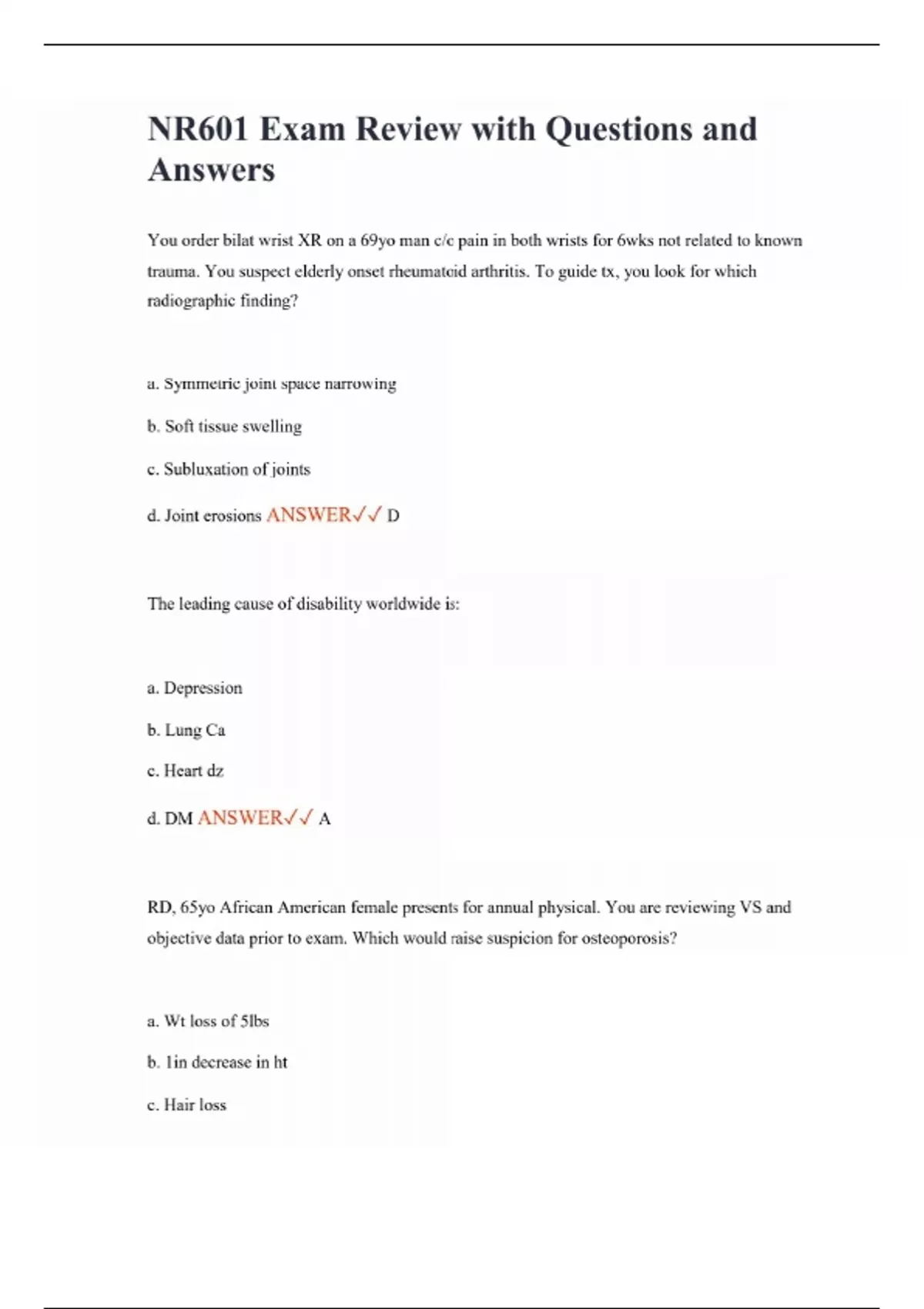 NR601 Exam Review with Questions and Answers You order bilat wrist XR on a 69yo man c/o pain in both wrists for 6wks not related to known trauma. You suspect elderly onset rheumatoid arthritis. To guide tx, you look for which radiographic finding? a. Symmetric joint space narrowing b. Soft tissue swelling c. Subluxation of joints d. Joint erosions ANSWER D The leading cause of disability worldwide is: a. Depression b. Lung Ca c. Heart dz d. DM ANSWER A RD, 65yo African American female presents for annual physical. You are reviewing VS and objective data prior to exam. Which would raise suspicion for osteoporosis? a. Wt loss of 5lbs b. 1in decrease in ht c. Hair loss d. Decreased appetite ANSWER B