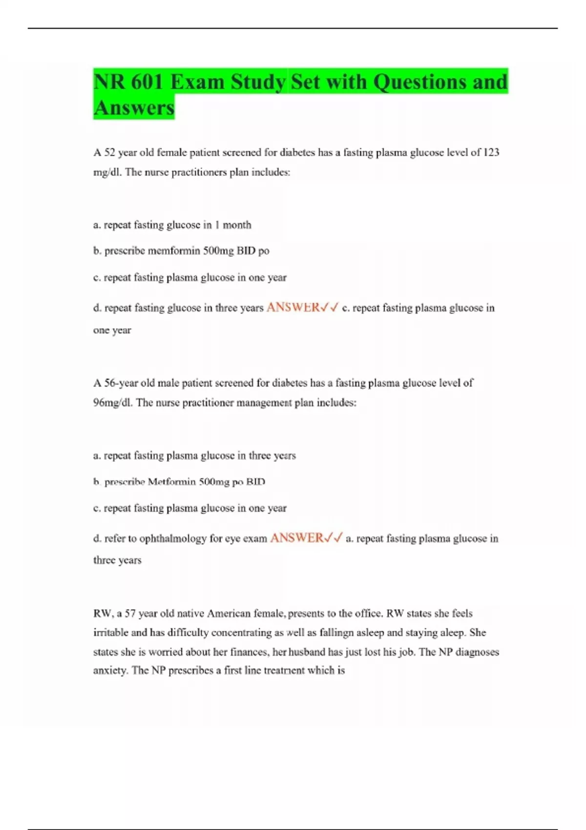 NR 601 Exam Study Set with Questions and Answers A 52 year old female patient screened for diabetes has a fasting plasma glucose level of 123 mg/dl. The nurse practitioners plan includes: a. repeat fasting glucose in 1 month b. prescribe memformin 500mg BID po c. repeat fasting plasma glucose in one year d. repeat fasting glucose in three years ANSWER c. repeat fasting plasma glucose in one year A 56-year old male patient screened for diabetes has a fasting plasma glucose level of 96mg/dl. The nurse practitioner management plan includes: a. repeat fasting plasma glucose in three years b. prescribe Metformin 500mg po BID c. repeat fasting plasma glucose in one year d. refer to ophthalmology for eye exam ANSWER a. repeat fasting plasma glucose in three years RW, a 57 year old native American female, presents to the office. RW states she feels irritable and has difficulty concentrating as well as fallingn asleep and staying aleep. She states she is worried about her finances, her husband has just lost his job. The NP diagnoses anxiety. The NP prescribes a first line treatment which is