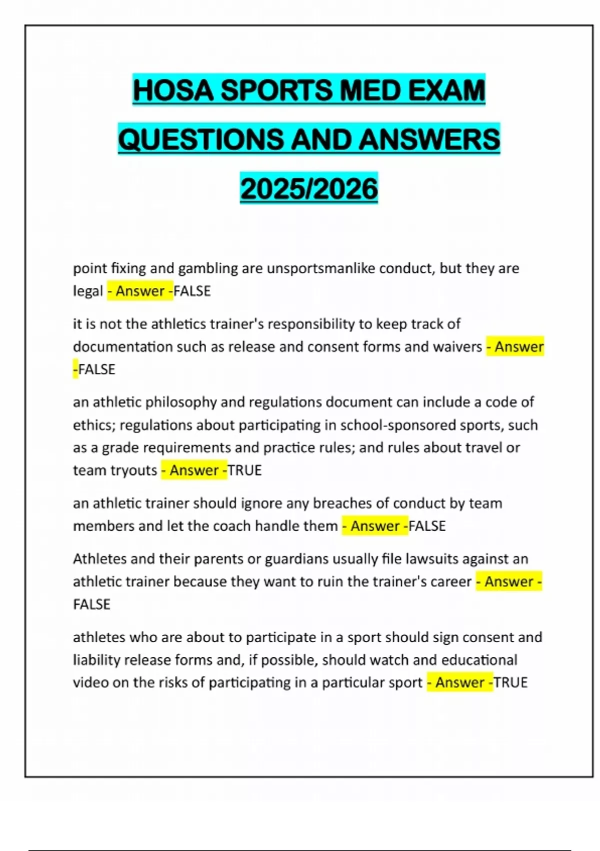 HOSA SPORTS MED EXAM QUESTIONS AND ANSWERS 2025/2026 point fixing and gambling are unsportsmanlike conduct, but they are legal - Answer -FALSE it is not the athletics trainer's responsibility to keep track of documentation such as release and consent forms and waivers - Answer -FALSE an athletic philosophy and regulations document can include a code of ethics; regulations about participating in school-sponsored sports, such as a grade requirements and practice rules; and rules about travel or team tryouts - Answer -TRUE an athletic trainer should ignore any breaches of conduct by team members and let the coach handle them - Answer -FALSE Athletes and their parents or guardians usually file lawsuits against an athletic trainer because they want to ruin the trainer's career - Answer - FALSE athletes who are about to participate in a sport should sign consent and liability release forms and, if possible, should watch and educational video on the risks of participating in a particular sport - Answer -TRUEwritten standards for conduct, behavior, or moral philosophy are known as a - Answer -code of ethics according to the National Athletic Trainers' Association Code of Ethics, members should respect the rights, welfare, and _____ of all individuals - Answer -dignity if there is a conflict between a professional code of ethics and the laws of a particular state, the _________ prevails - Answer -law acting in the best interests of individuals athletes as well as the team as a whole is a _____ process - Answer -complex failure to give reasonable care or to do what another prudent person with similar experience, knowledge, or background would have done under similar circumstances is called ________ - Answer -negligence an athletes _____ records are confidential - Answer -medical when an athletic trainer keeps thorough and accurate paperwork, it - Answer -establishes the athlete's assumption of risk. ethics are essential for bringing about the best sports experience for all participants - Answer -true parents who are behaving ethically will - Answer -support all the participants in an athletic contest all sports medicine professionals should carry insurance to protect against claims of - Answer -malpractice in general, the sports medicine profession