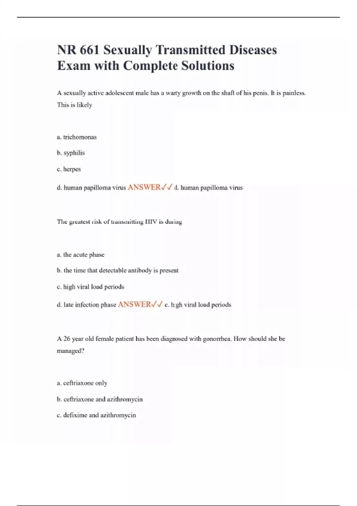 NR 661 Sexually Transmitted Diseases Exam with Complete Solutions A sexually active adolescent male has a warty growth on the shaft of his penis. It is painless. This is likely a. trichomonas b. syphilis c. herpes d. human papilloma virus ANSWER d. human papilloma virus The greatest risk of transmitting HIV is during a. the acute phase b. the time that detectable antibody is present c. high viral load periods d. late infection phase ANSWER c. high viral load periods A 26 year old female patient has been diagnosed with gonorrhea. How should she be managed? a. ceftriaxone only b. ceftriaxone and azithromycin c. defixime and azithromycin