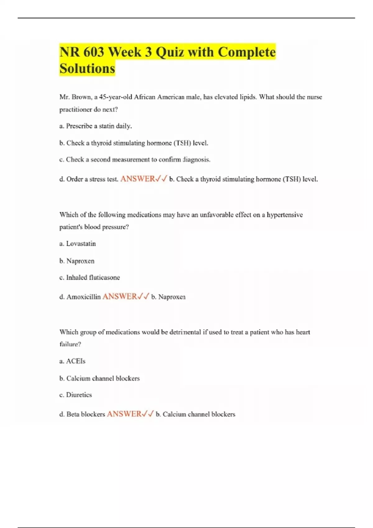 NR 603 Week 3 Quiz with Complete Solutions Mr. Brown, a 45-year-old African American male, has elevated lipids. What should the nurse practitioner do next? a. Prescribe a statin daily. b. Check a thyroid stimulating hormone (TSH) level. c. Check a second measurement to confirm diagnosis. d. Order a stress test. ANSWER b. Check a thyroid stimulating hormone (TSH) level. Which of the following medications may have an unfavorable effect on a hypertensive patient's blood pressure? a. Lovastatin b. Naproxen c. Inhaled fluticasone d. Amoxicillin ANSWER b. Naproxen Which group of medications would be detrimental if used to treat a patient who has heart failure? a. ACEIs b. Calcium channel blockers c. Diuretics d. Beta blockers ANSWER b. Calcium channel blockers
