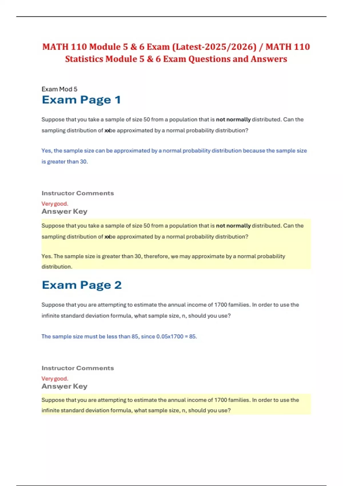 This document includes the combined exam questions and answers for MATH 110 Modules 5 and 6 in Introduction to Statistics from Portage Learning, updated for the 2025/2026 academic year. Topics covered span from sampling distributions and the Central Limit Theorem (Module 5) to normal distributions and z-scores (Module 6). Ideal for mastering two core modules in one comprehensive resource.