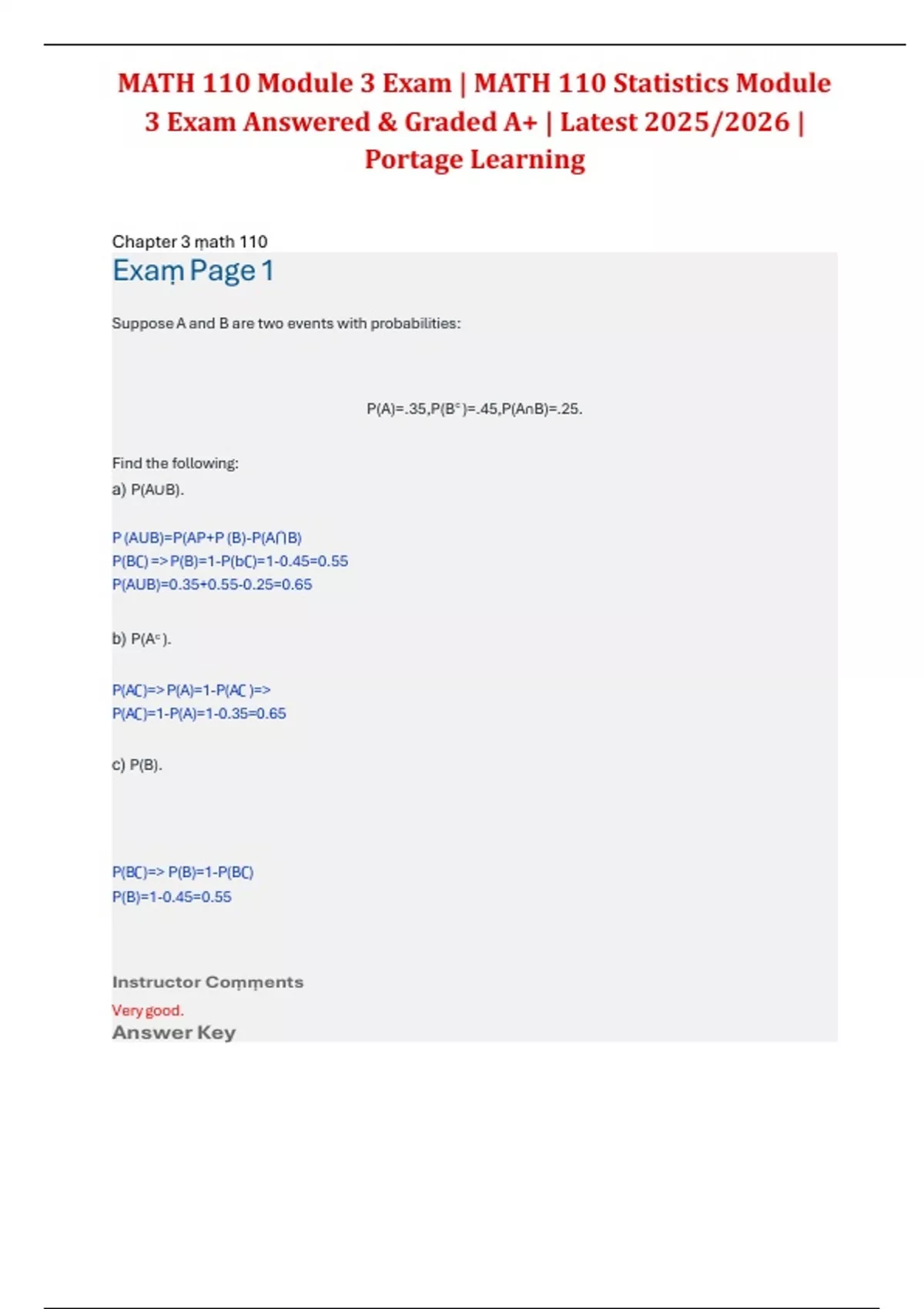 This document contains the fully answered and A+ graded exam for MATH 110 Module 3 in Introduction to Statistics at Portage Learning, updated for the 2025/2026 academic year. It covers essential topics such as measures of central tendency, variability, and data interpretation. A reliable study aid for mastering foundational statistical concepts.