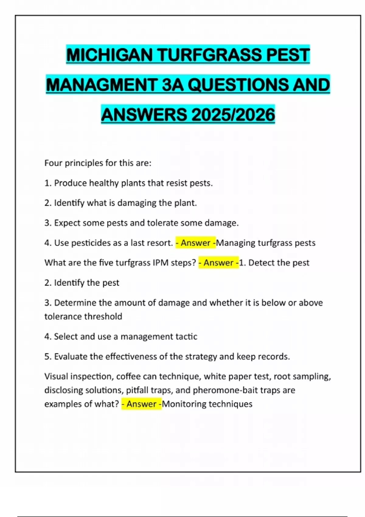 MICHIGAN TURFGRASS PEST MANAGMENT 3A QUESTIONS AND ANSWERS 2025/2026 Four principles for this are: 1. Produce healthy plants that resist pests. 2. Identify what is damaging the plant. 3. Expect some pests and tolerate some damage. 4. Use pesticides as a last resort. - Answer -Managing turfgrass pests What are the five turfgrass IPM steps? - Answer -1. Detect the pest 2. Identify the pest 3. Determine the amount of damage and whether it is below or above tolerance threshold 4. Select and use a management tactic 5. Evaluate the effectiveness of the strategy and keep records. Visual inspection, coffee can technique, white paper test, root sampling, disclosing solutions, pitfall traps, and pheromone-bait traps are examples of what? - Answer -Monitoring techniquesWhy is it better to keep track of degree day accumulations instead of calendar days? - Answer -Both plant growth and pest development depend on the amount of heat that surrounds an organism. An organism shouldn't be classified and treated as this until it is proven to be one. Most species of insects, fungi, nematodes and bacteria are either harmless or beneficial to turf. - Answer -Pest Many of these are directly associated with a specific species or cultivar (variety) of grass. Knowing the cultivar growing in a particular area may help you diagnose the problem. - Answer -Turfgrass disorder This is defined as the density of pests at which damage to the turf will occur. - Answer -Economic injury level (EIL) This is the pest density at which action must be taken to prevent the pest from reaching the economic injury level. - Answer -Action threshold What are: 1. Client's tolerance of pest damage 2. Visibility or use of the turn stand 3. Level of maintenance 4. Health and vigor of the turf stand 5. The degree of risk from the pest injury to the plant host 6. Expected pest reduction by natural controls - Answer -Factors affecting turfgrass injury level