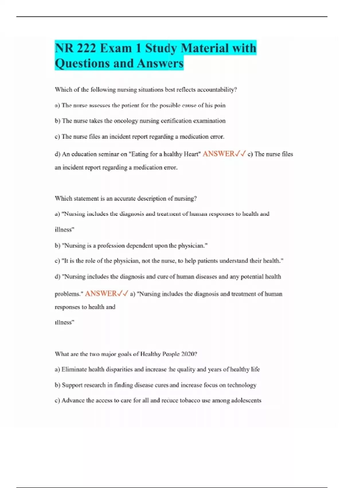 NR 222 Exam 1 Study Material with Questions and Answers Which of the following nursing situations best reflects accountability? a) The nurse assesses the patient for the possible cause of his pain b) The nurse takes the oncology nursing certification examination c) The nurse files an incident report regarding a medication error. d) An education seminar on "Eating for a healthy Heart" ANSWER c) The nurse files an incident report regarding a medication error. Which statement is an accurate description of nursing? a) "Nursing includes the diagnosis and treatment of human responses to health and illness" b) "Nursing is a profession dependent upon the physician." c) "It is the role of the physician, not the nurse, to help patients understand their health." d) "Nursing includes the diagnosis and cure of human diseases and any potential health problems." ANSWER a) "Nursing includes the diagnosis and treatment of human responses to health and illness" What are the two major goals of Healthy People 2020? a) Eliminate health disparities and increase the quality and years of healthy life b) Support research in finding disease cures and increase focus on technology c) Advance the access to care for all and reduce tobacco use among adolescents