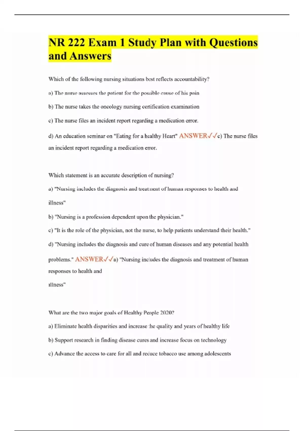 NR 222 Exam 1 Study Plan with Questions and Answers Which of the following nursing situations best reflects accountability? a) The nurse assesses the patient for the possible cause of his pain b) The nurse takes the oncology nursing certification examination c) The nurse files an incident report regarding a medication error. d) An education seminar on "Eating for a healthy Heart" ANSWERc) The nurse files an incident report regarding a medication error. Which statement is an accurate description of nursing? a) "Nursing includes the diagnosis and treatment of human responses to health and illness" b) "Nursing is a profession dependent upon the physician." c) "It is the role of the physician, not the nurse, to help patients understand their health." d) "Nursing includes the diagnosis and cure of human diseases and any potential health problems." ANSWERa) "Nursing includes the diagnosis and treatment of human responses to health and illness" What are the two major goals of Healthy People 2020? a) Eliminate health disparities and increase the quality and years of healthy life b) Support research in finding disease cures and increase focus on technology c) Advance the access to care for all and reduce tobacco use among adolescents