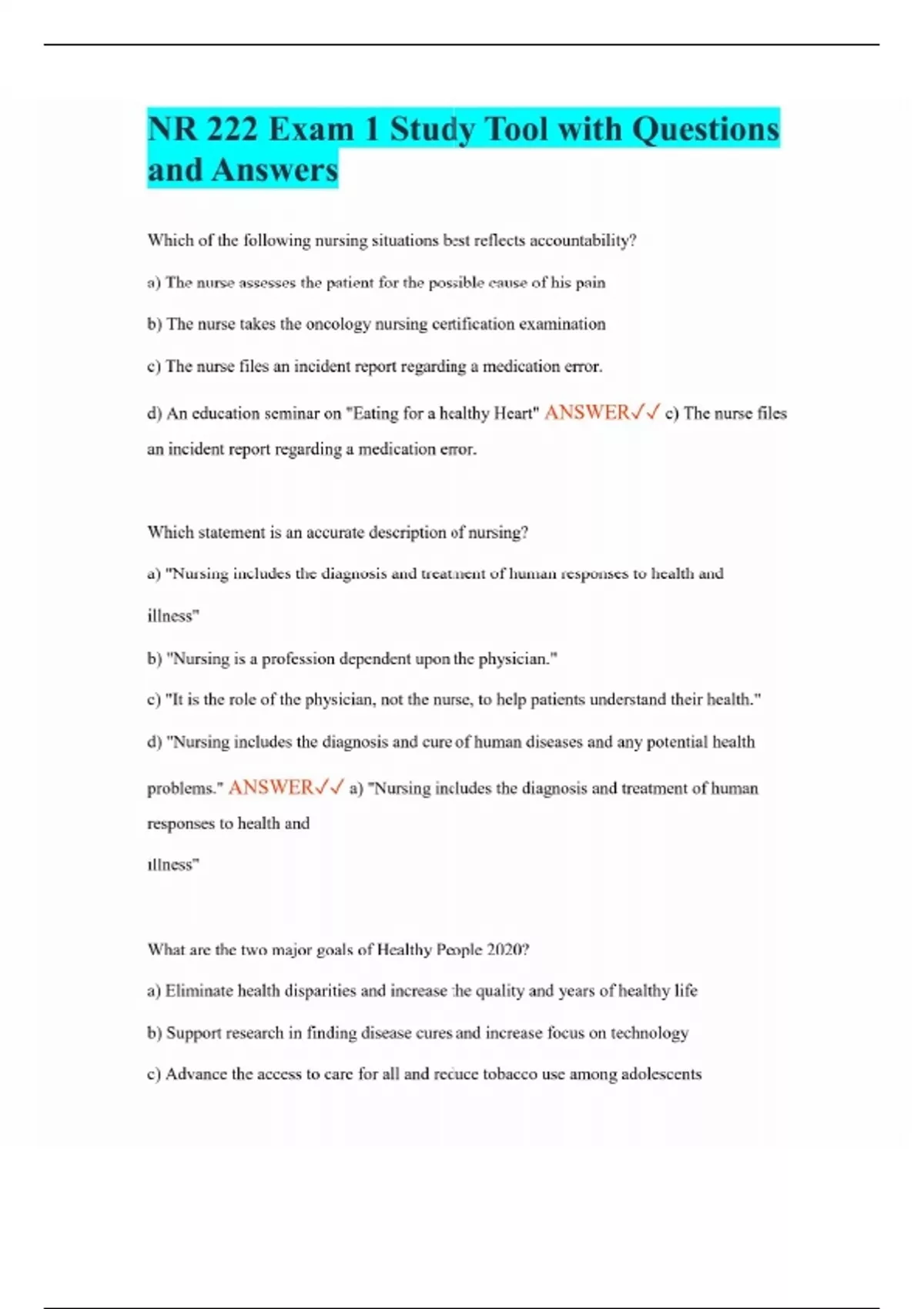 NR 222 Exam 1 Study Tool with Questions and Answers Which of the following nursing situations best reflects accountability? a) The nurse assesses the patient for the possible cause of his pain b) The nurse takes the oncology nursing certification examination c) The nurse files an incident report regarding a medication error. d) An education seminar on "Eating for a healthy Heart" ANSWER c) The nurse files an incident report regarding a medication error. Which statement is an accurate description of nursing? a) "Nursing includes the diagnosis and treatment of human responses to health and illness" b) "Nursing is a profession dependent upon the physician." c) "It is the role of the physician, not the nurse, to help patients understand their health." d) "Nursing includes the diagnosis and cure of human diseases and any potential health problems." ANSWER a) "Nursing includes the diagnosis and treatment of human responses to health and illness" What are the two major goals of Healthy People 2020? a) Eliminate health disparities and increase the quality and years of healthy life b) Support research in finding disease cures and increase focus on technology c) Advance the access to care for all and reduce tobacco use among adolescents